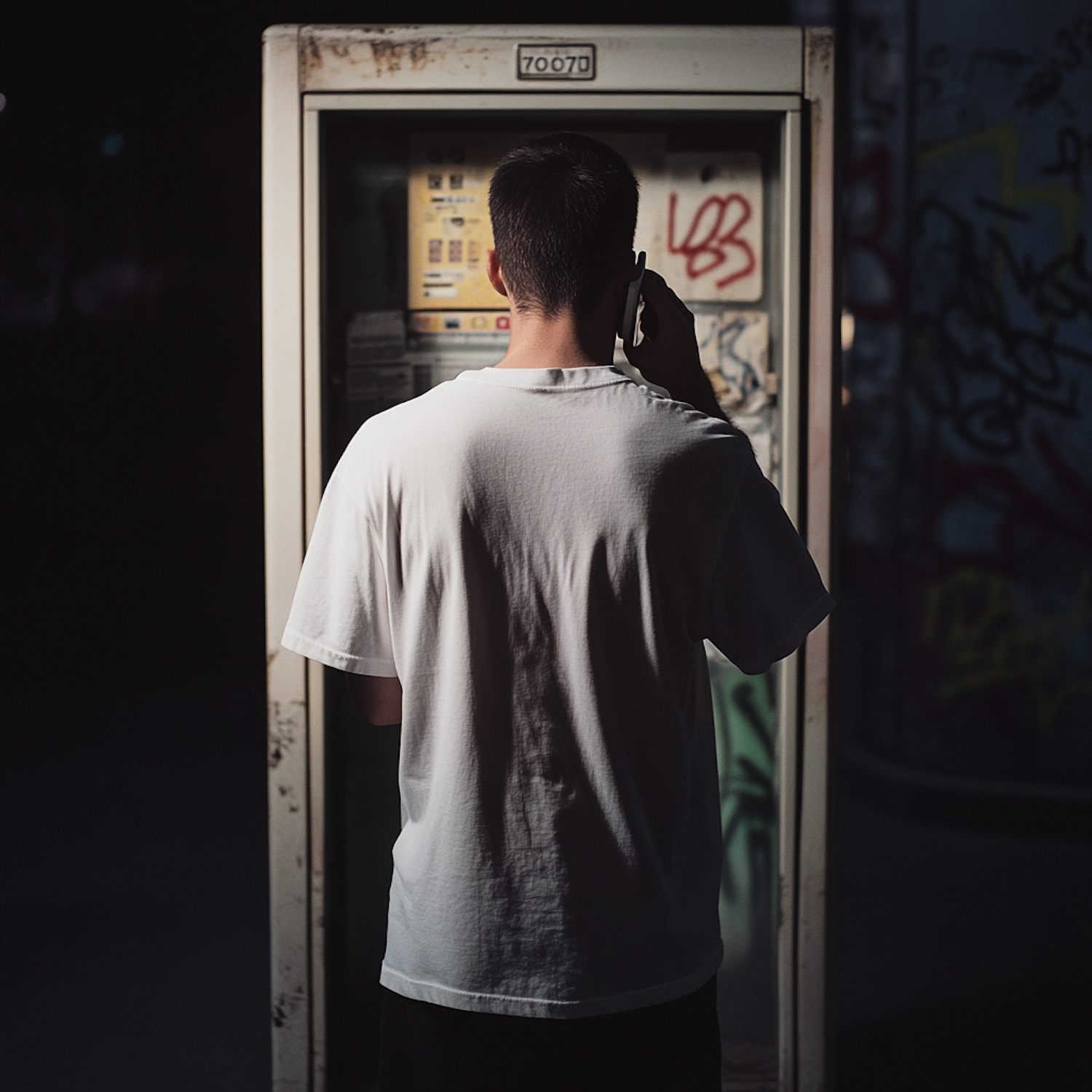 Man in white t-shirt using a phone in a graffiti-covered booth at night, illuminated against a dark urban backdrop.
