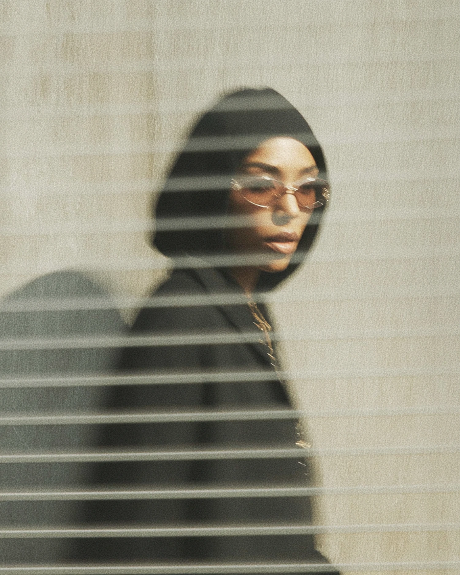 A person in a black hoodie and sunglasses seen through blinds, creating a mysterious and modern urban aesthetic.