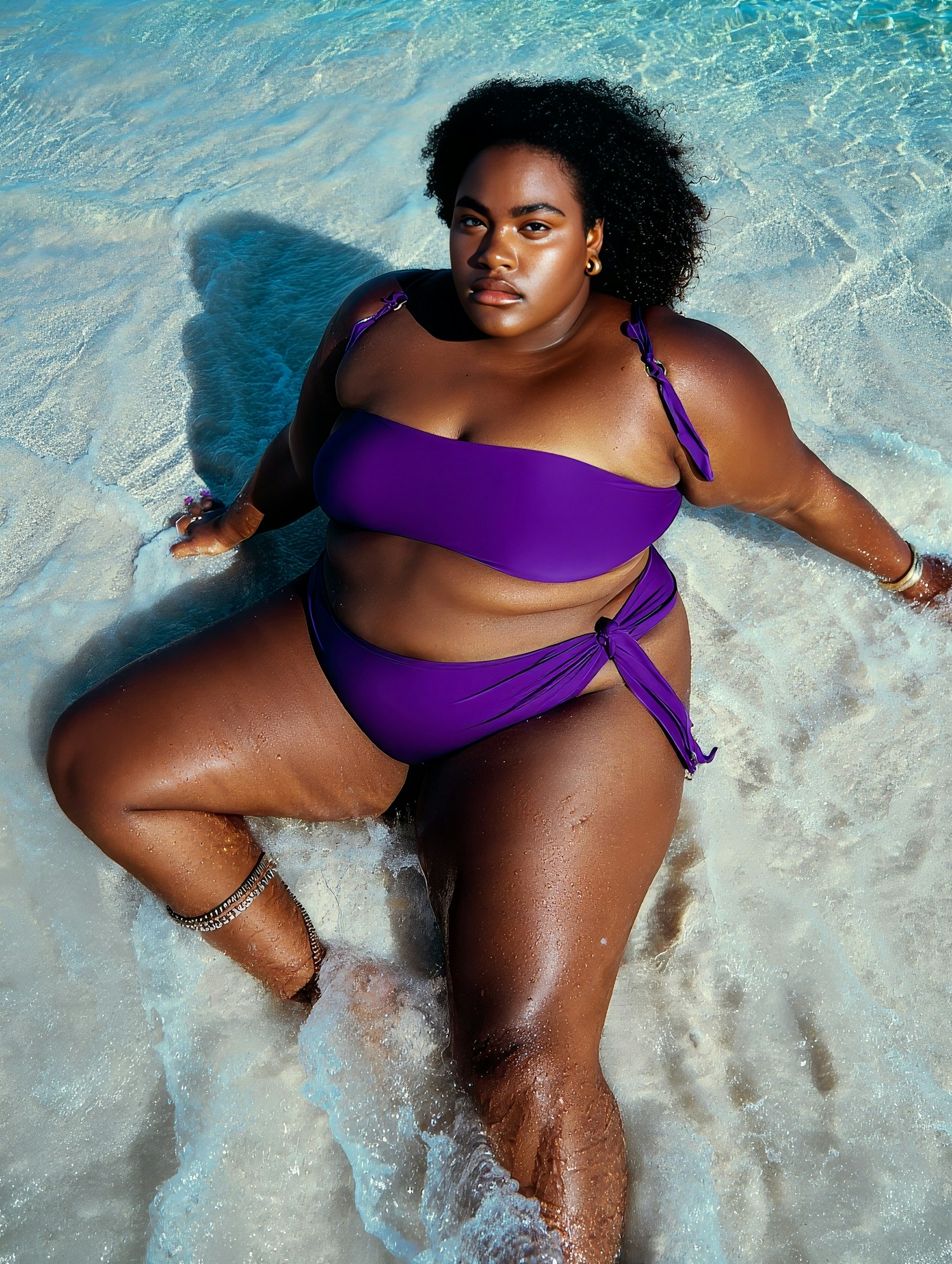 A person enjoying a sunny day by the beach, wearing a striking purple swimsuit in clear, shallow waters.