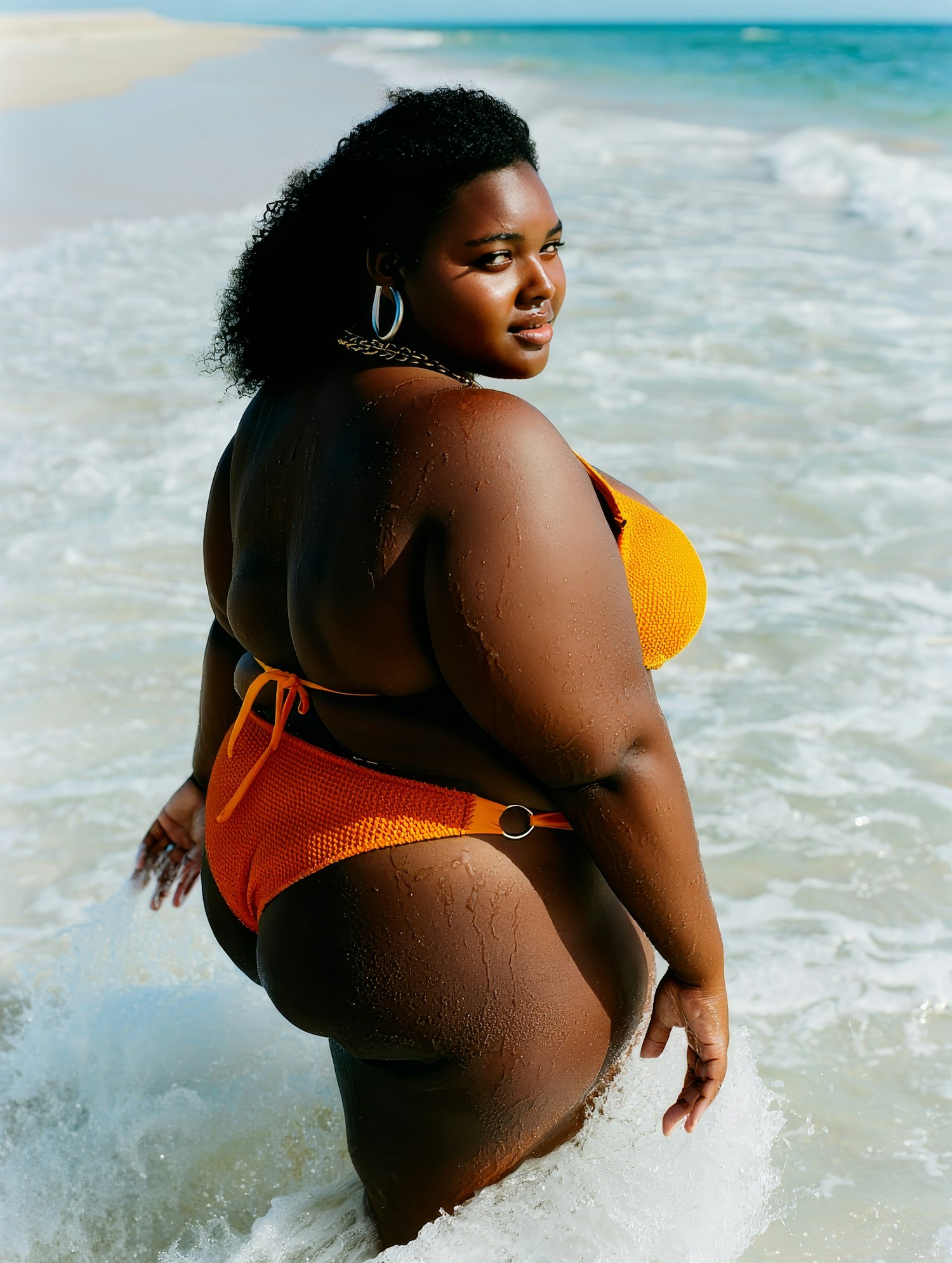 A confident individual enjoys the sunlight and ocean waves, wearing a vibrant orange swimsuit and standing against a serene beach backdrop.