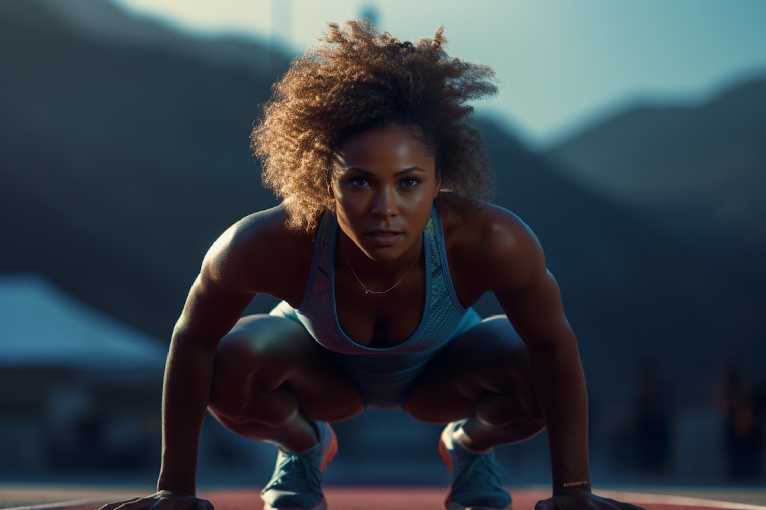 Focused athlete in starting position on track, ready to sprint. Sunlit, intense gaze, curly hair, blue sportswear, blurred mountain backdrop.