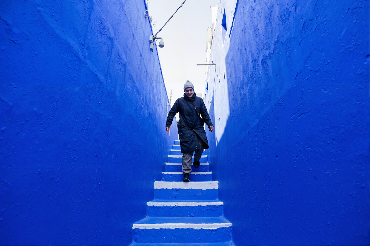 Man in a gray beanie walks down vibrant blue stairs, surrounded by matching blue walls, creating a striking monochromatic scene.