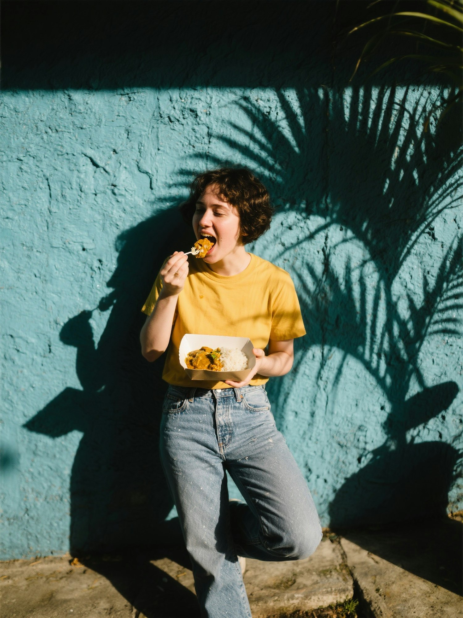 candid outdoor lifestyle photo, real moment of life, natural sunlight, hard shadows, vibrant but realistic colors, soft textures, casual summer outfit, dynamic framing, food-focused, authentic and spontaneous mood, a person leaning against a textured duck blue wall while eating curry and rice from a paper tray, wearing a mustard yellow t-shirt and high-waisted jeans, sunlight casting shadows from plants on the wall, warm and moody atmosphere