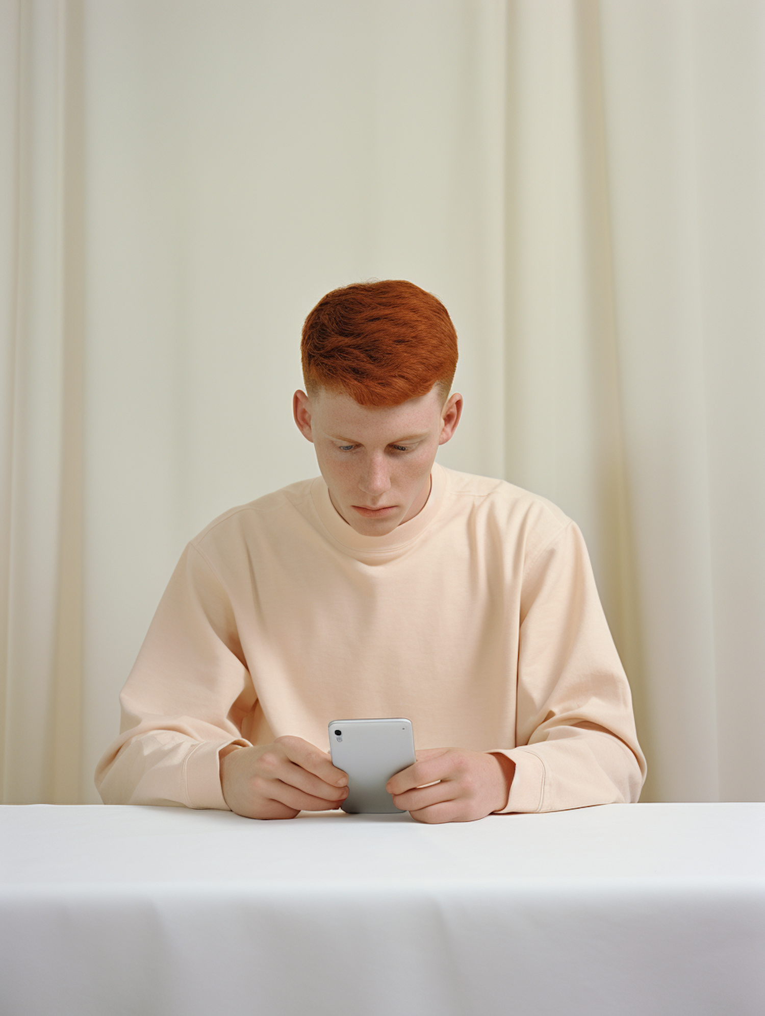 Young man with red hair focused on his smartphone, seated at a table in a minimalist setting.