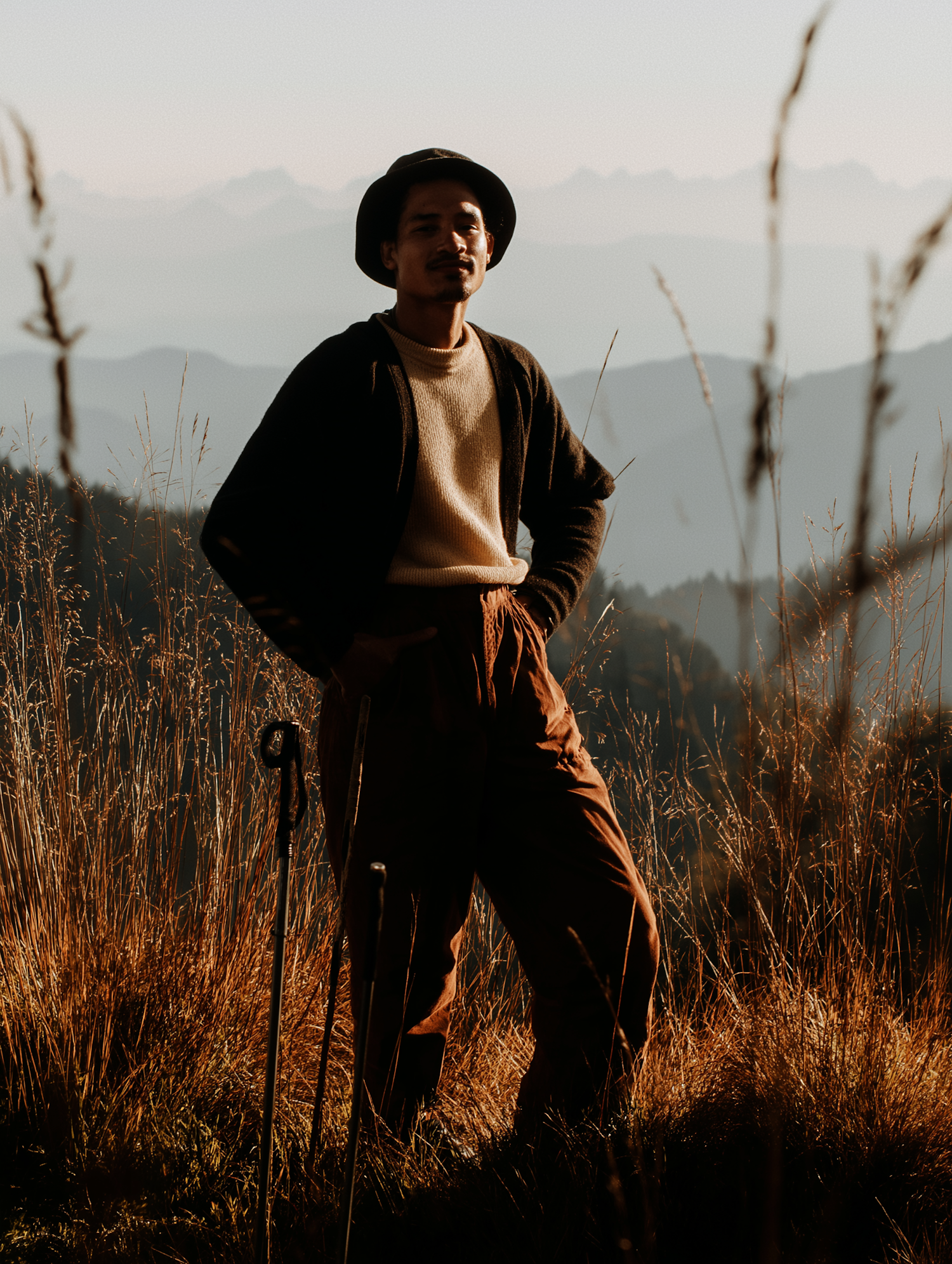 A person stands in golden field at sunrise, with mountainous scenery in the background. Their attire hints at a trekking setting.