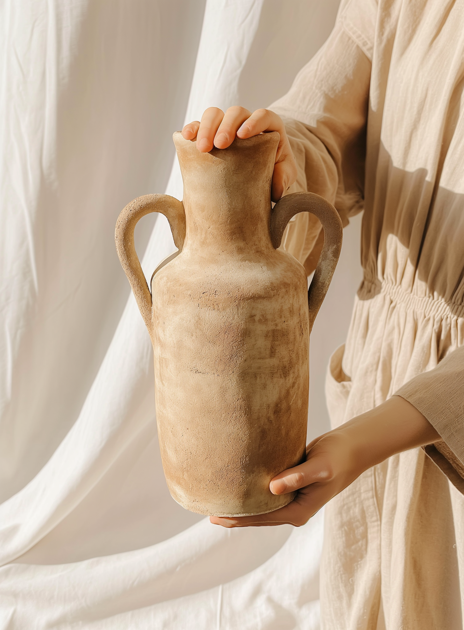A rustic clay vase with two handles held by hands in a beige outfit, set against a soft white fabric background.