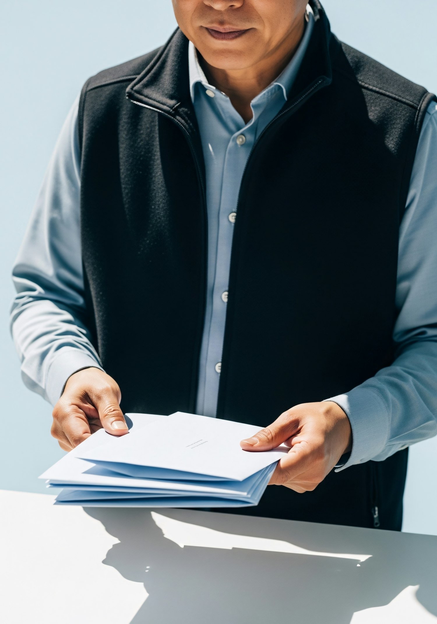 A person in a black vest and blue shirt holds a stack of white envelopes against a light blue background.