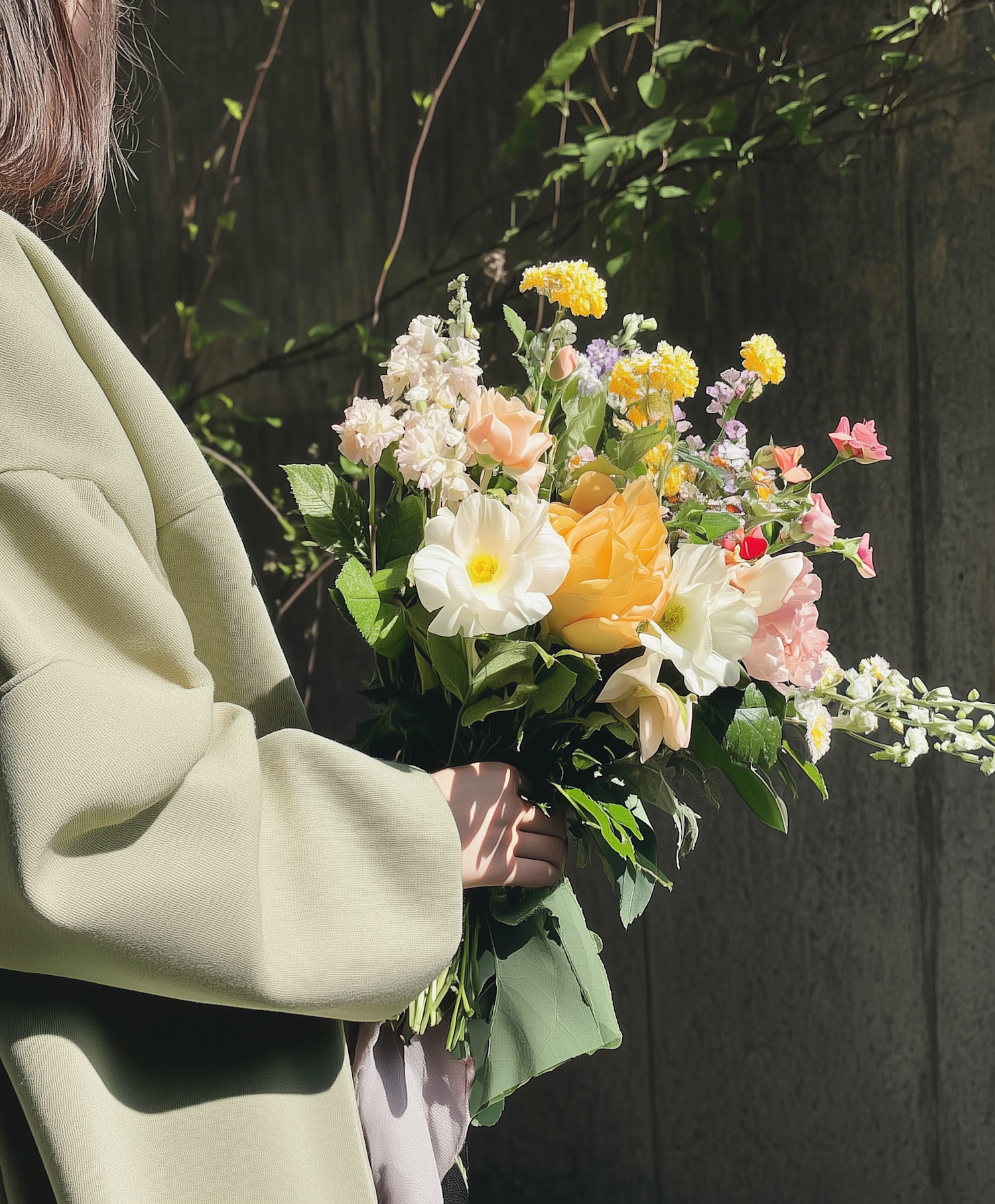 A close-up of a person holding a colorful bouquet of flowers in sunlight, wearing a light green coat against a dim outdoor background.
