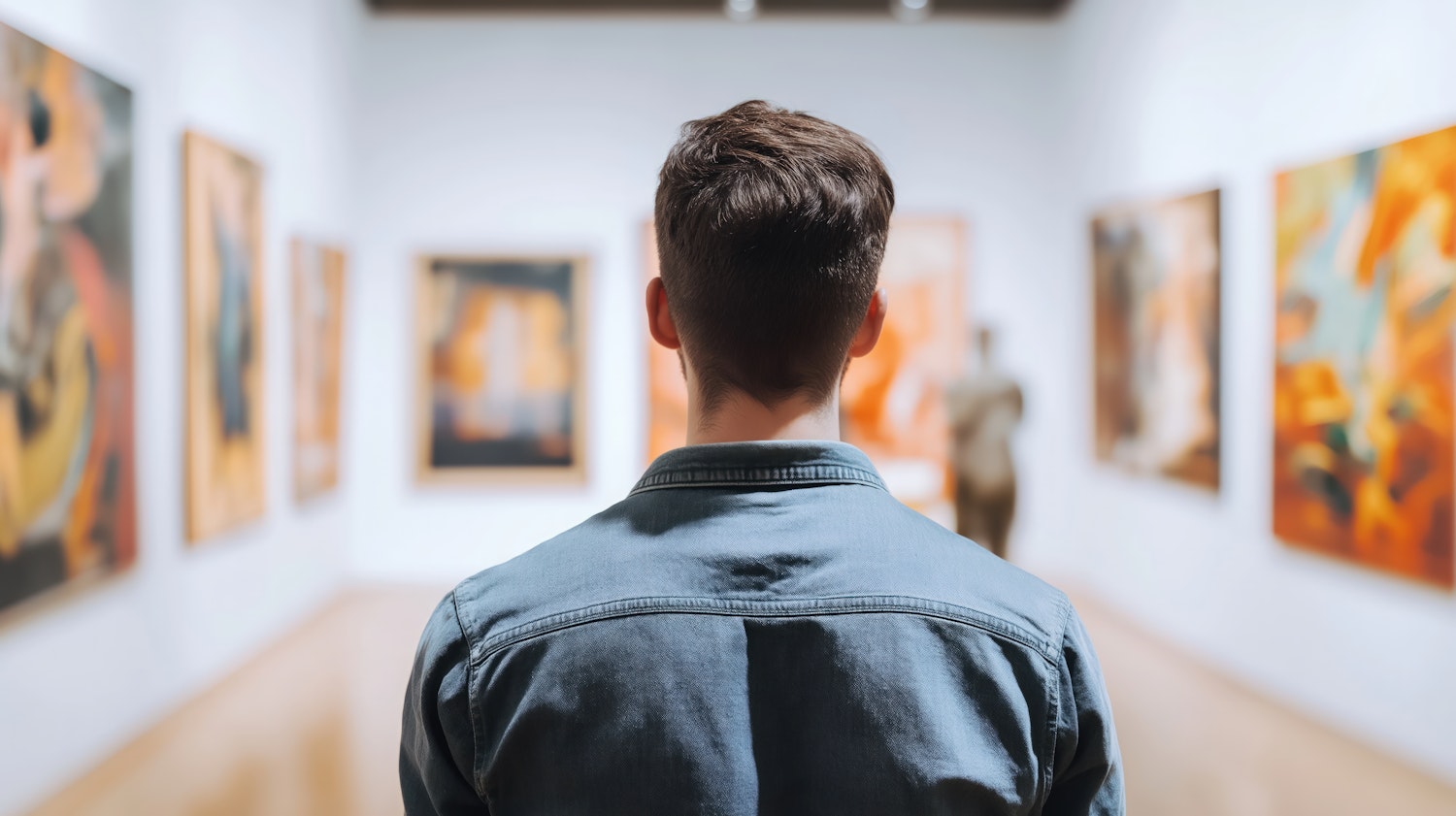 Man in denim jacket observes abstract art in a modern gallery setting, with vibrant paintings and soft lighting.