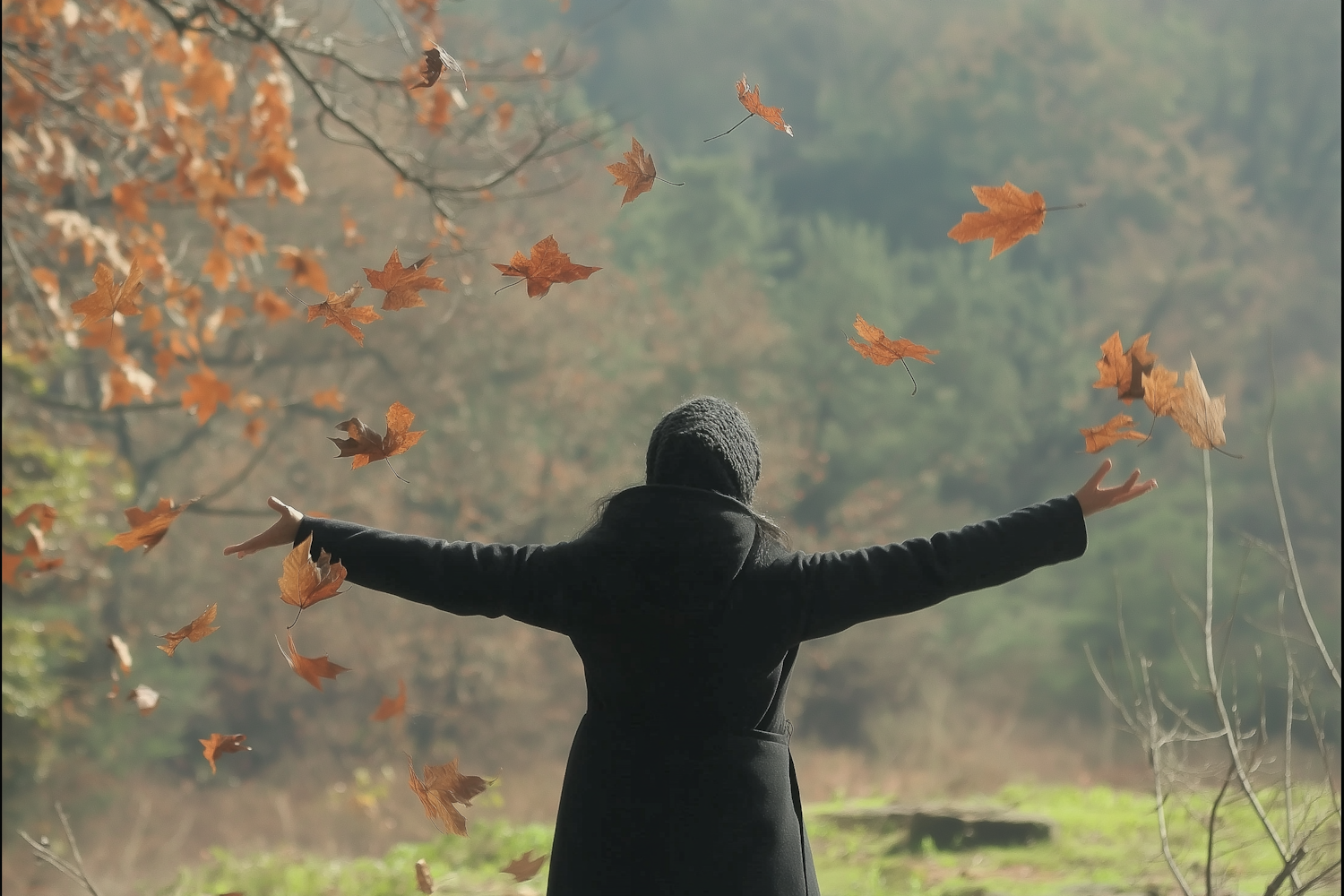 Person in black coat and hat with arms outstretched, surrounded by falling autumn leaves in a tranquil forest setting.