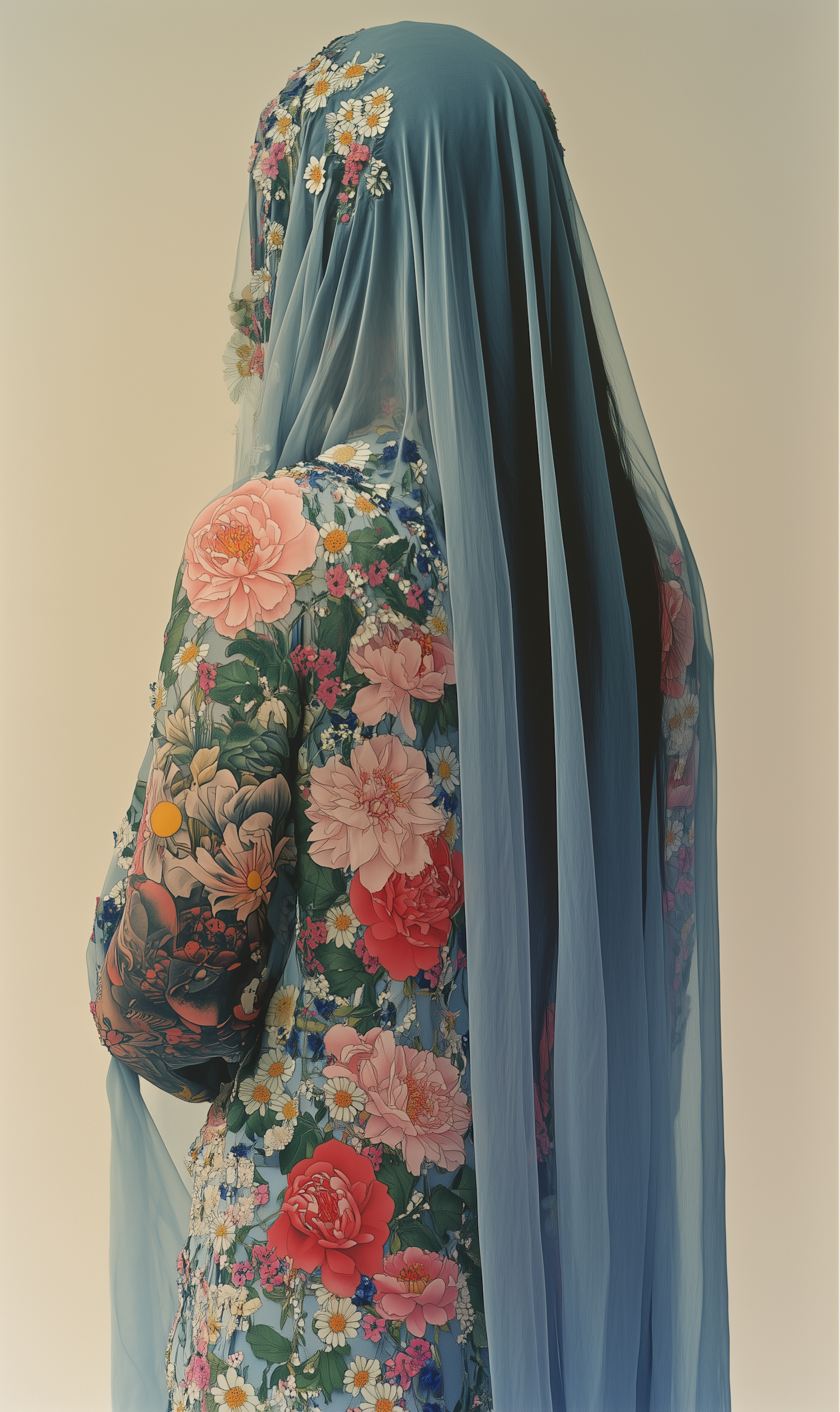 Elegant floral embroidery and sheer blue veil create a stunning visual effect in this artistic composition.