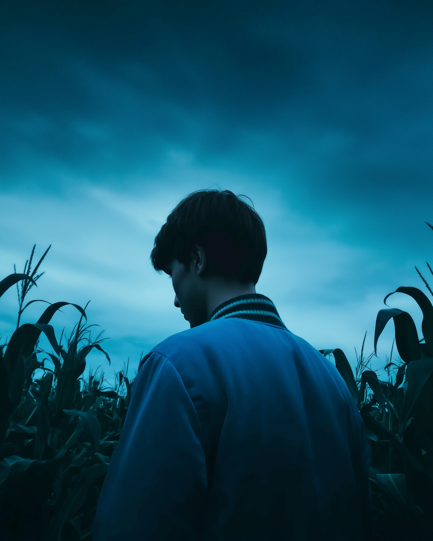 A person in a blue jacket stands in a cornfield under a moody, overcast sky, creating a serene and introspective atmosphere.