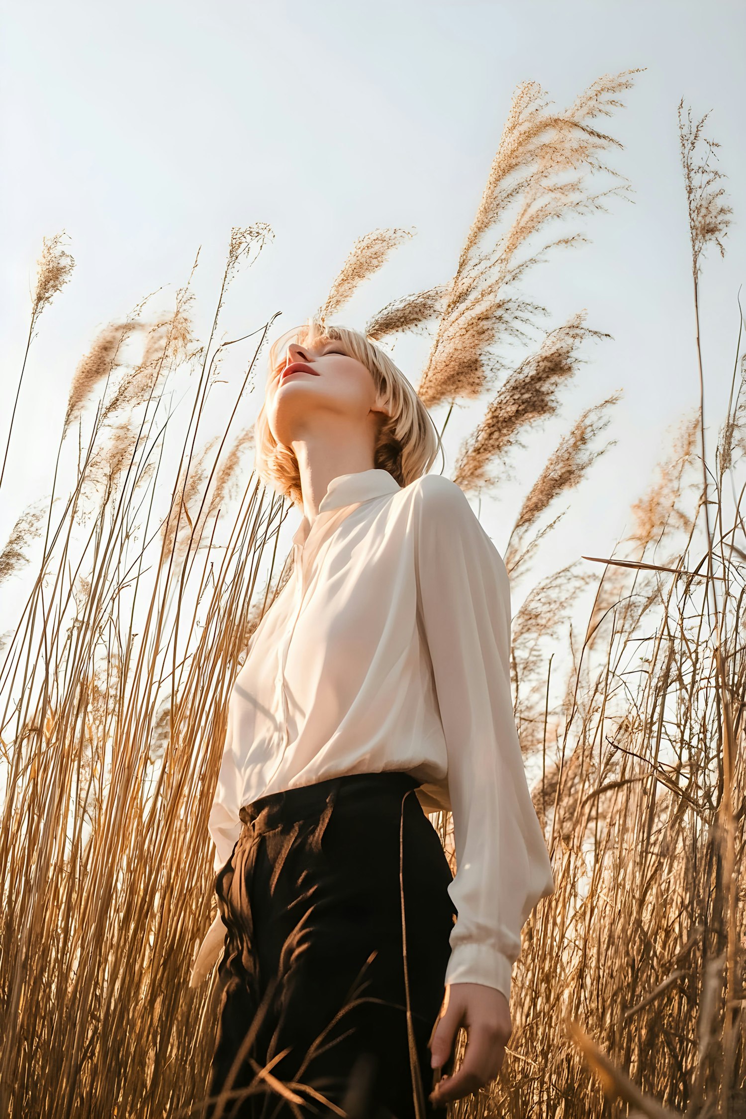 Person with blonde hair in white shirt stands in tall golden grasses, looking up at the sky. Warm sunlight creates a serene atmosphere.