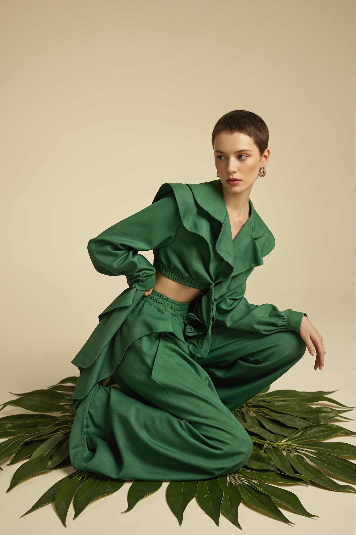 Woman in a vibrant green outfit kneeling on leaves, set against a beige background. Short hair, fair skin, and elegant metallic earrings.