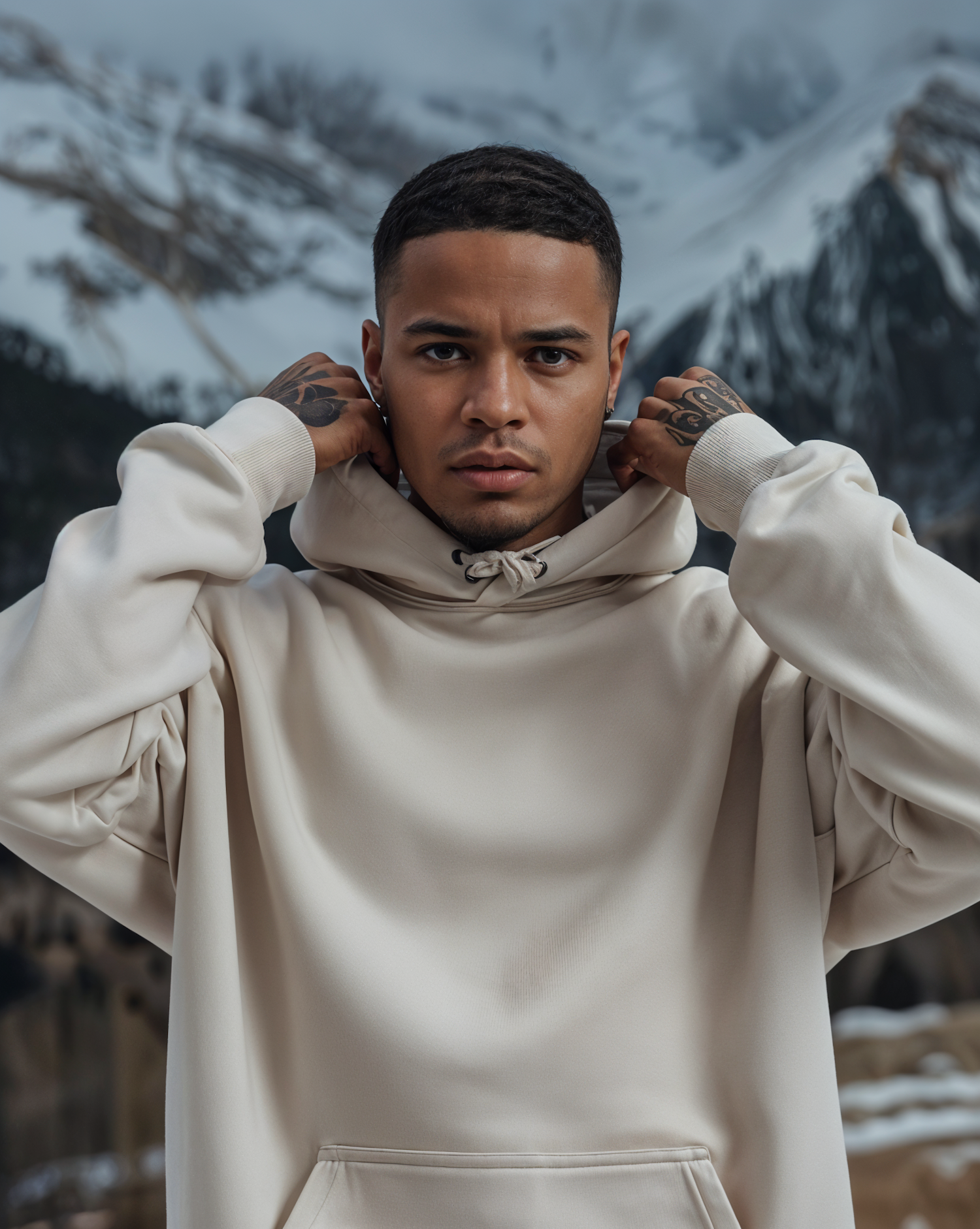 Young man in cream hoodie with tattoos stands against snow-capped mountains, exuding confidence and style.