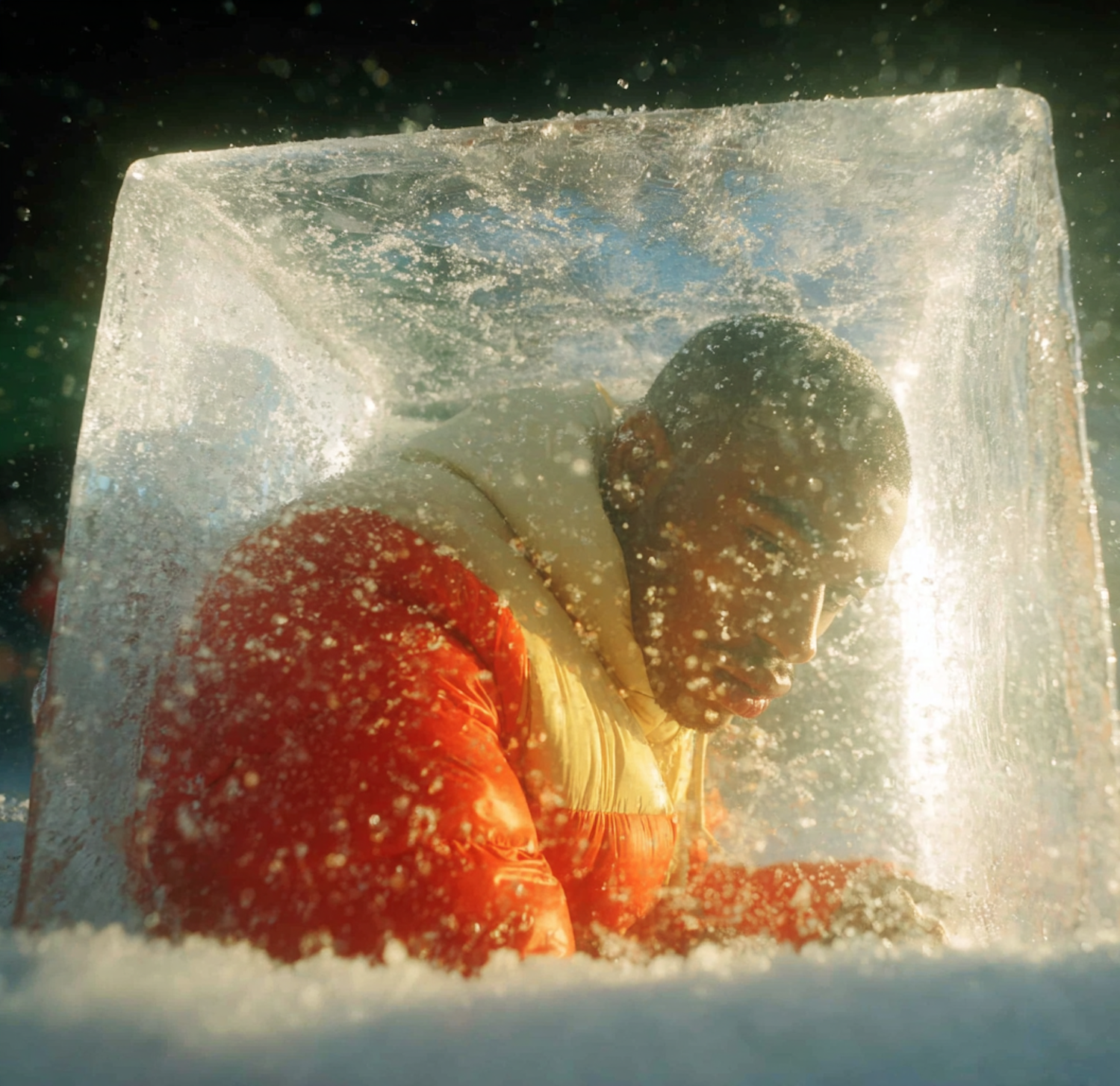 A person in a red and yellow jacket encased in a frosted ice block, surrounded by snow, creating a surreal and dramatic scene.