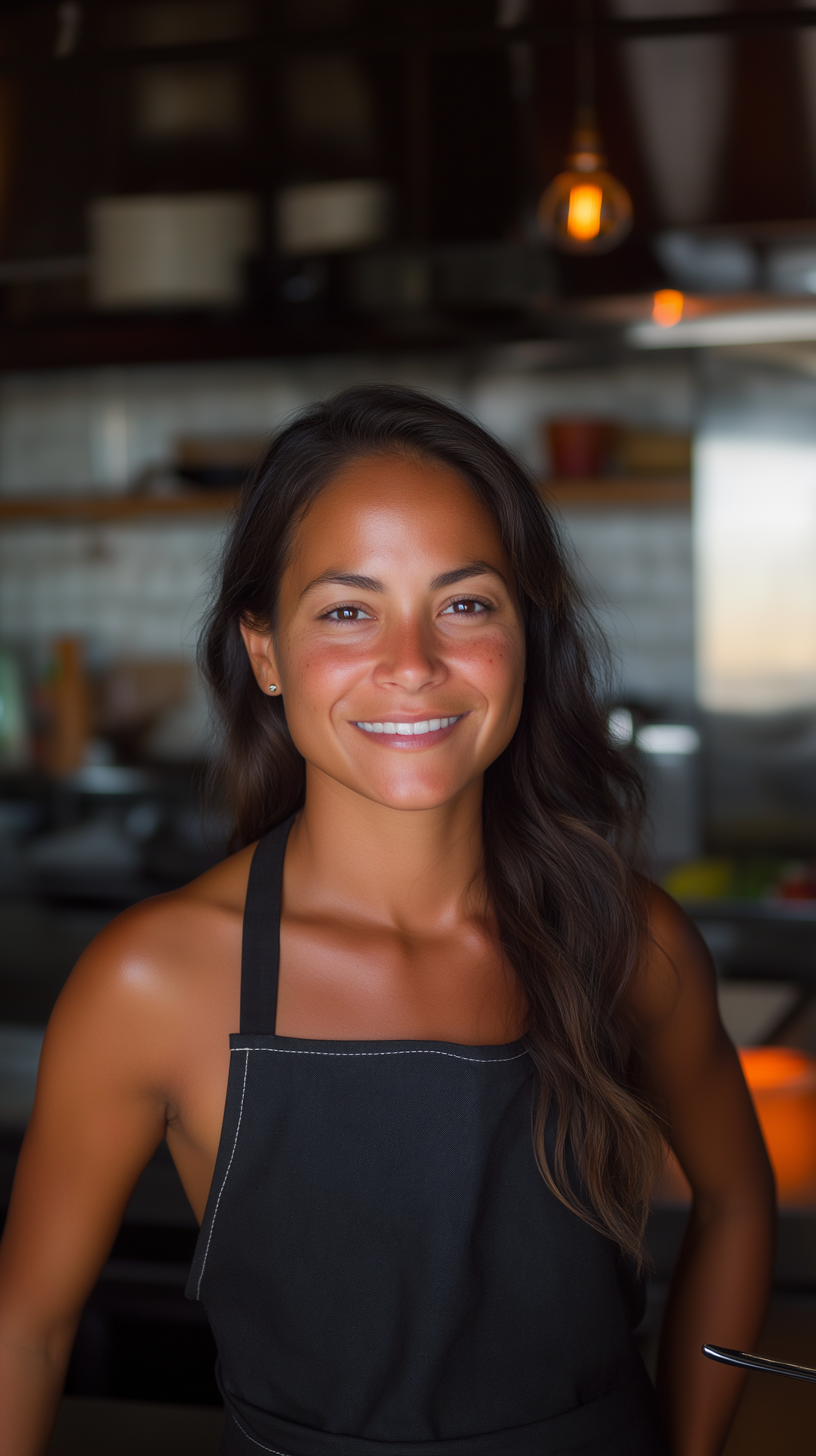 Smiling woman with long dark hair in a kitchen, wearing a black apron. Warm lighting and blurred background create a cozy atmosphere.