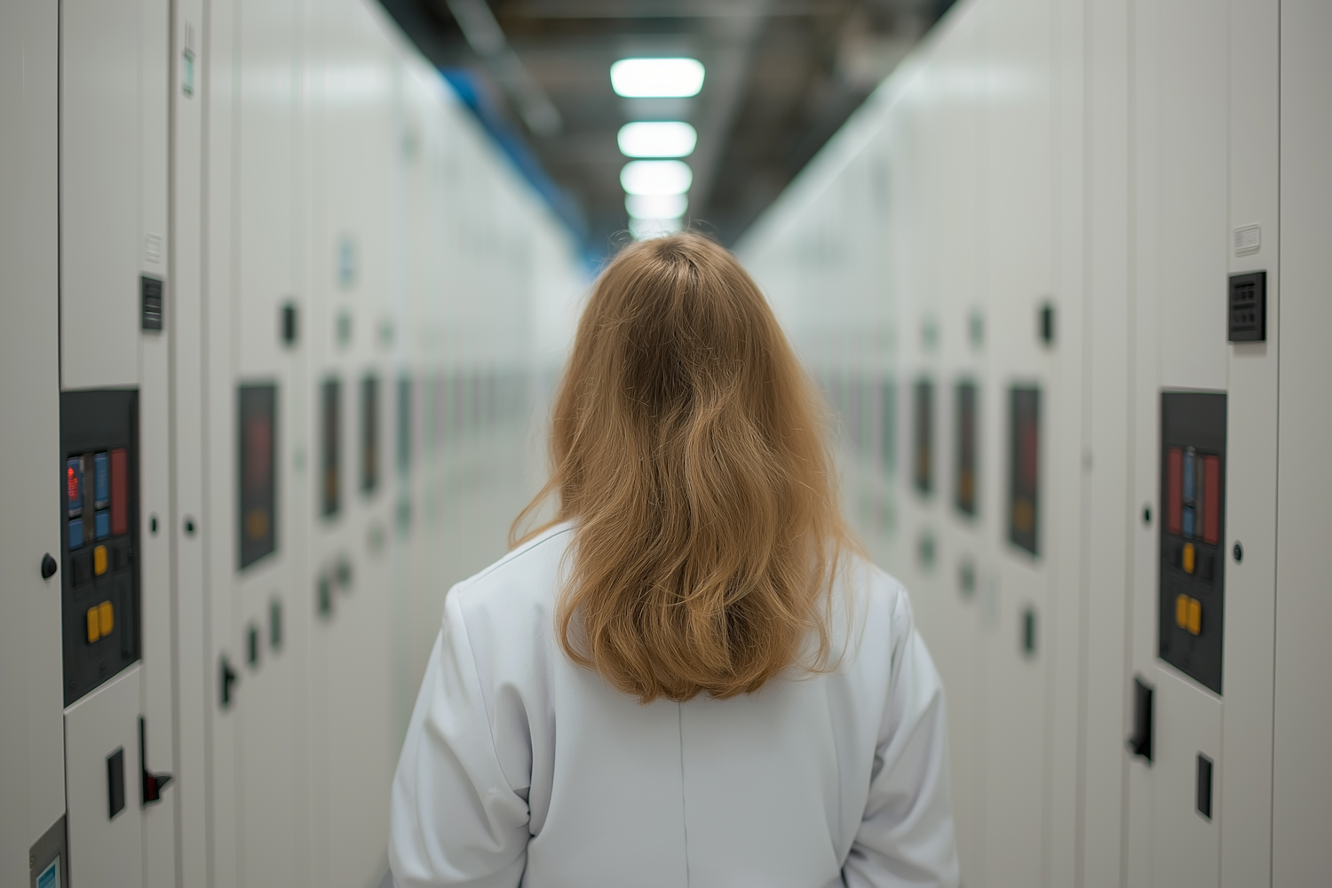 Person in a white lab coat walking down a corridor of server racks, highlighting a high-tech environment.