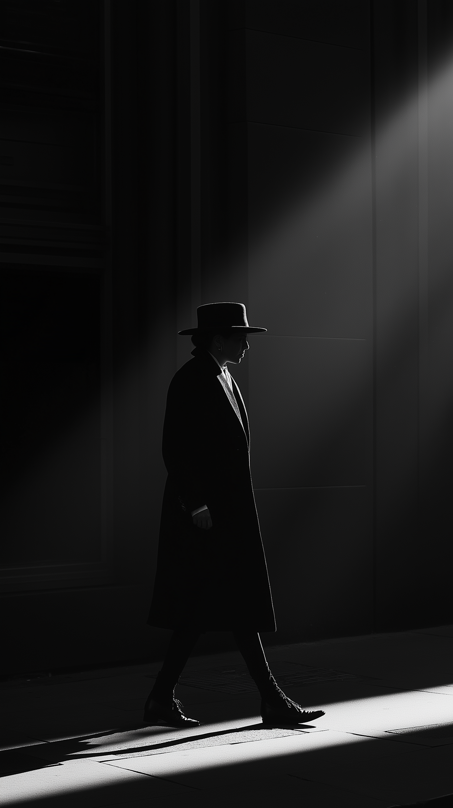 Dramatic black-and-white image of a person in a coat and hat walking through a beam of light, evoking a cinematic noir vibe.