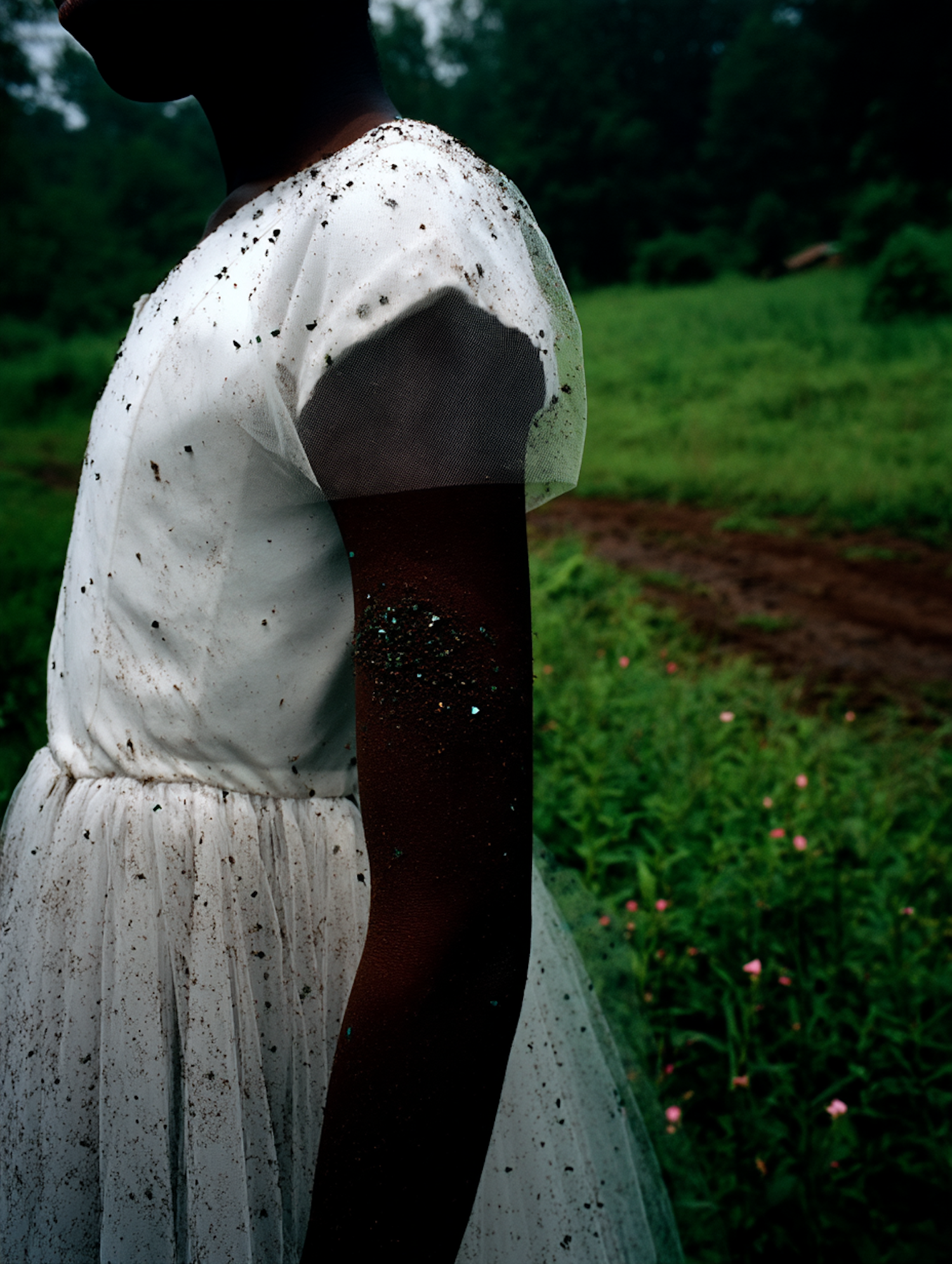 A side profile of a person outdoors, wearing a white dress with natural debris, set against a lush green background.