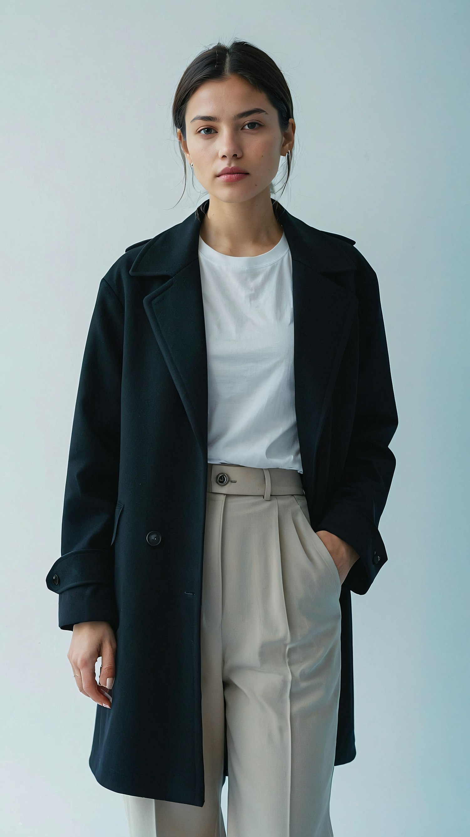 Asian woman in a black coat and beige trousers, exuding modern elegance with a minimalist style against a plain background.