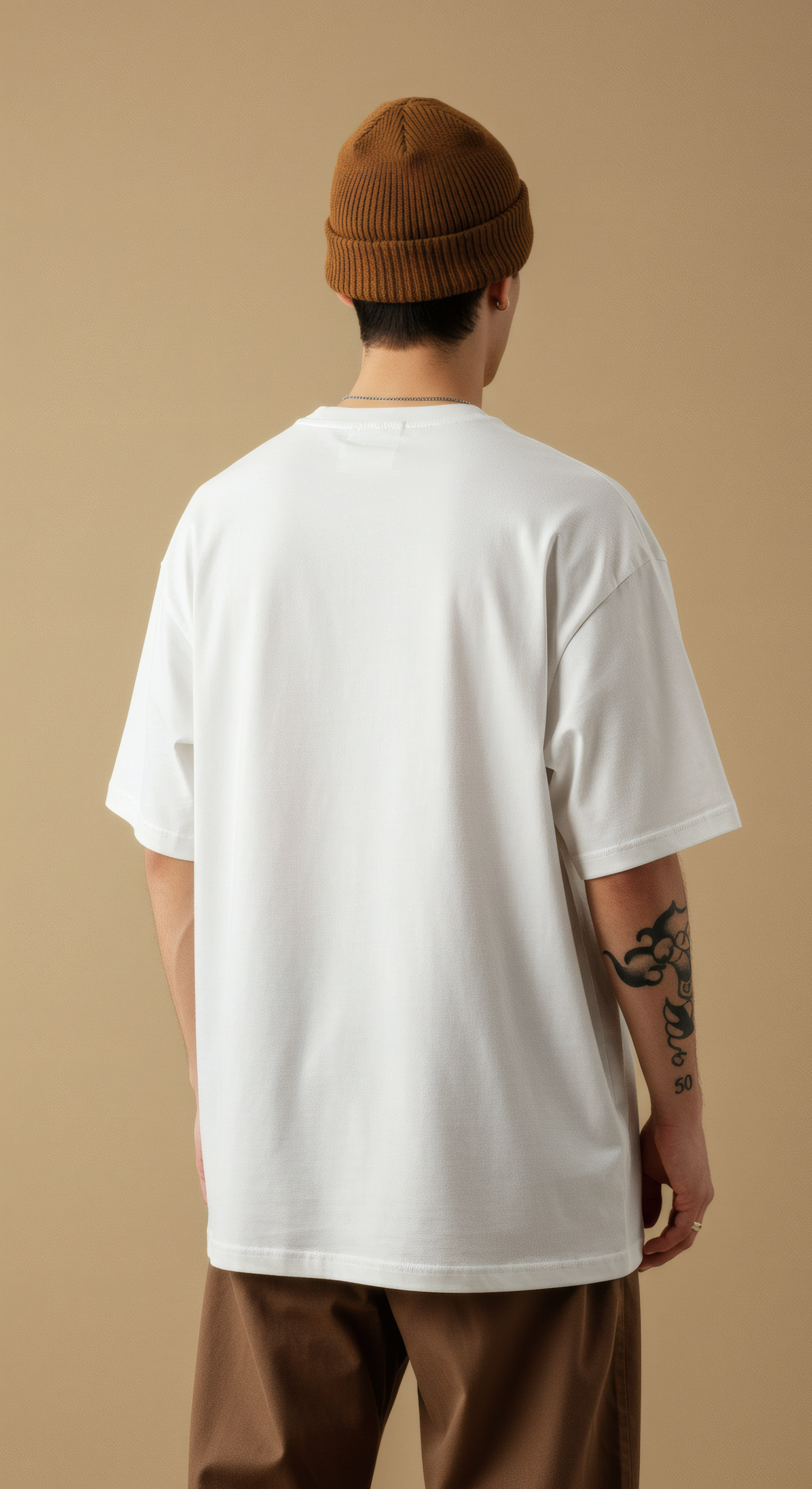 Man in white oversized T-shirt, brown pants, and brown beanie, showcasing a tattooed arm against a beige background.