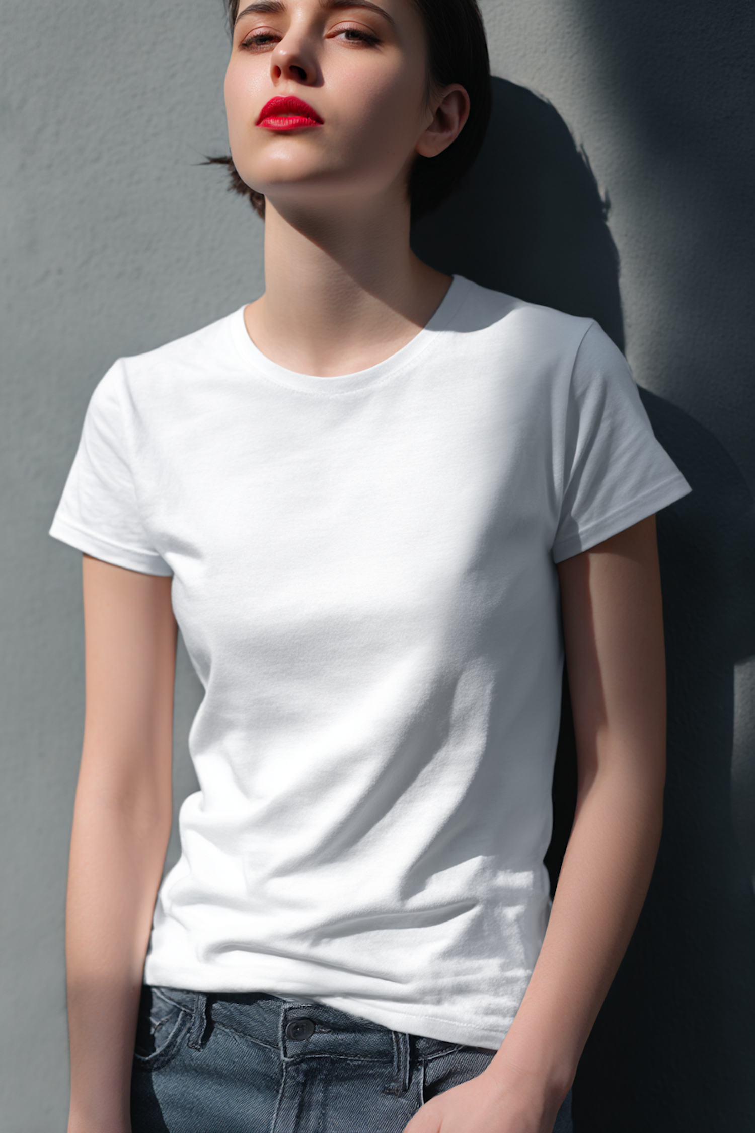 A person wearing a white T-shirt and jeans leans against a gray wall under bright natural light, glowing highlights and a bold red lipstick.