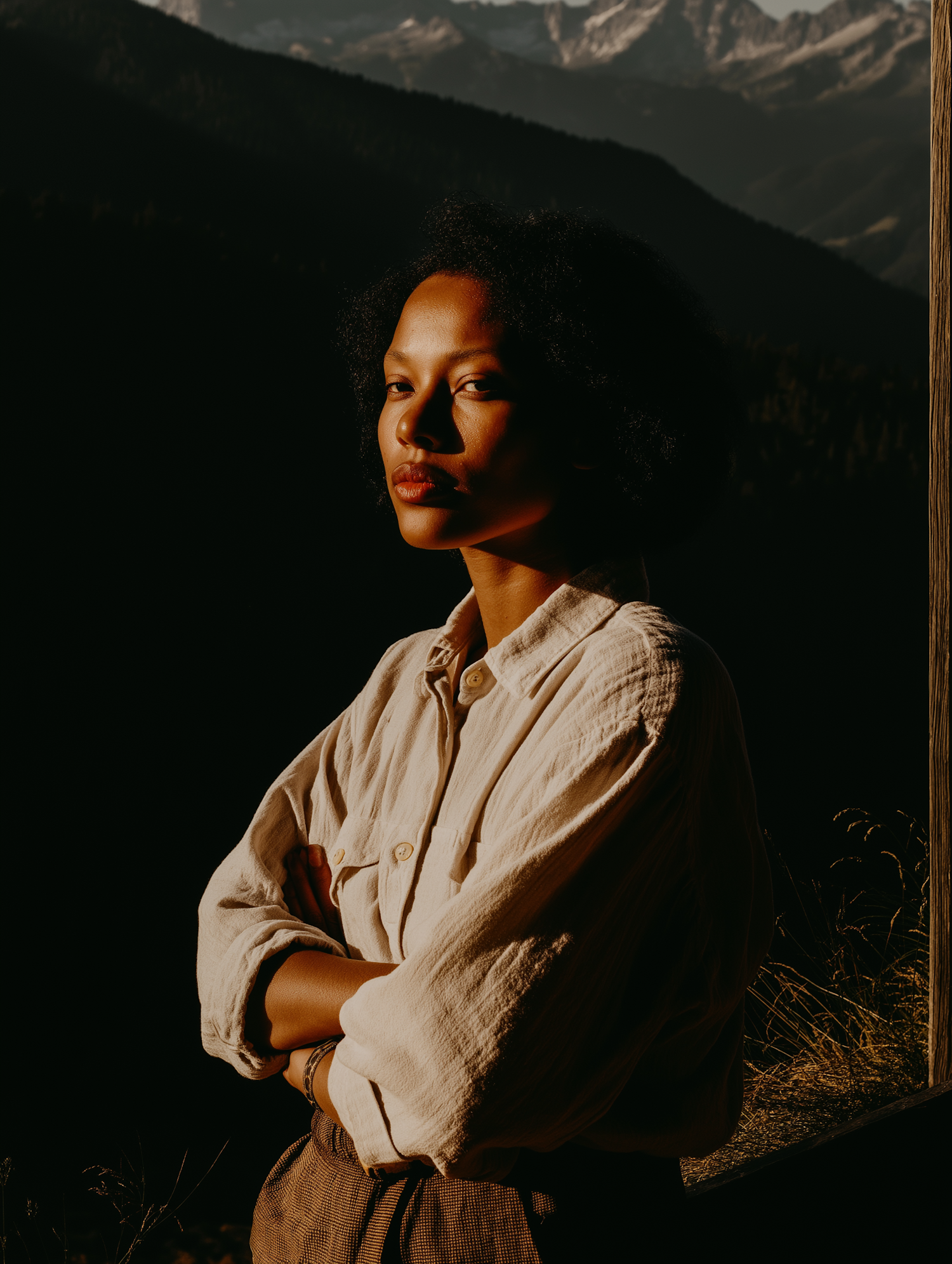 A person appears contemplative in golden-hour lighting against a mountainous backdrop in this stunning portrait.