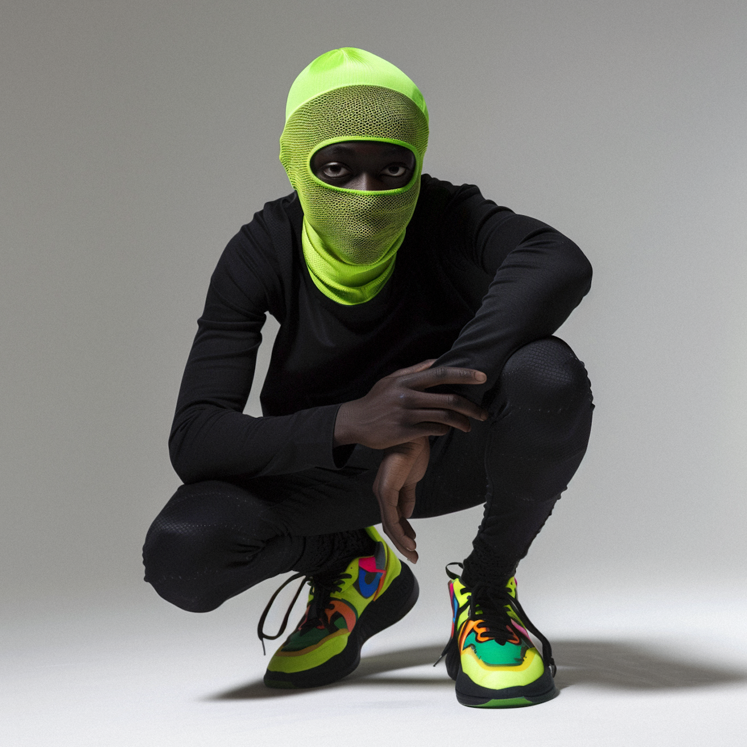 Crouching figure in neon green balaclava, black outfit, and vibrant multicolored sneakers in a minimalist studio setting.