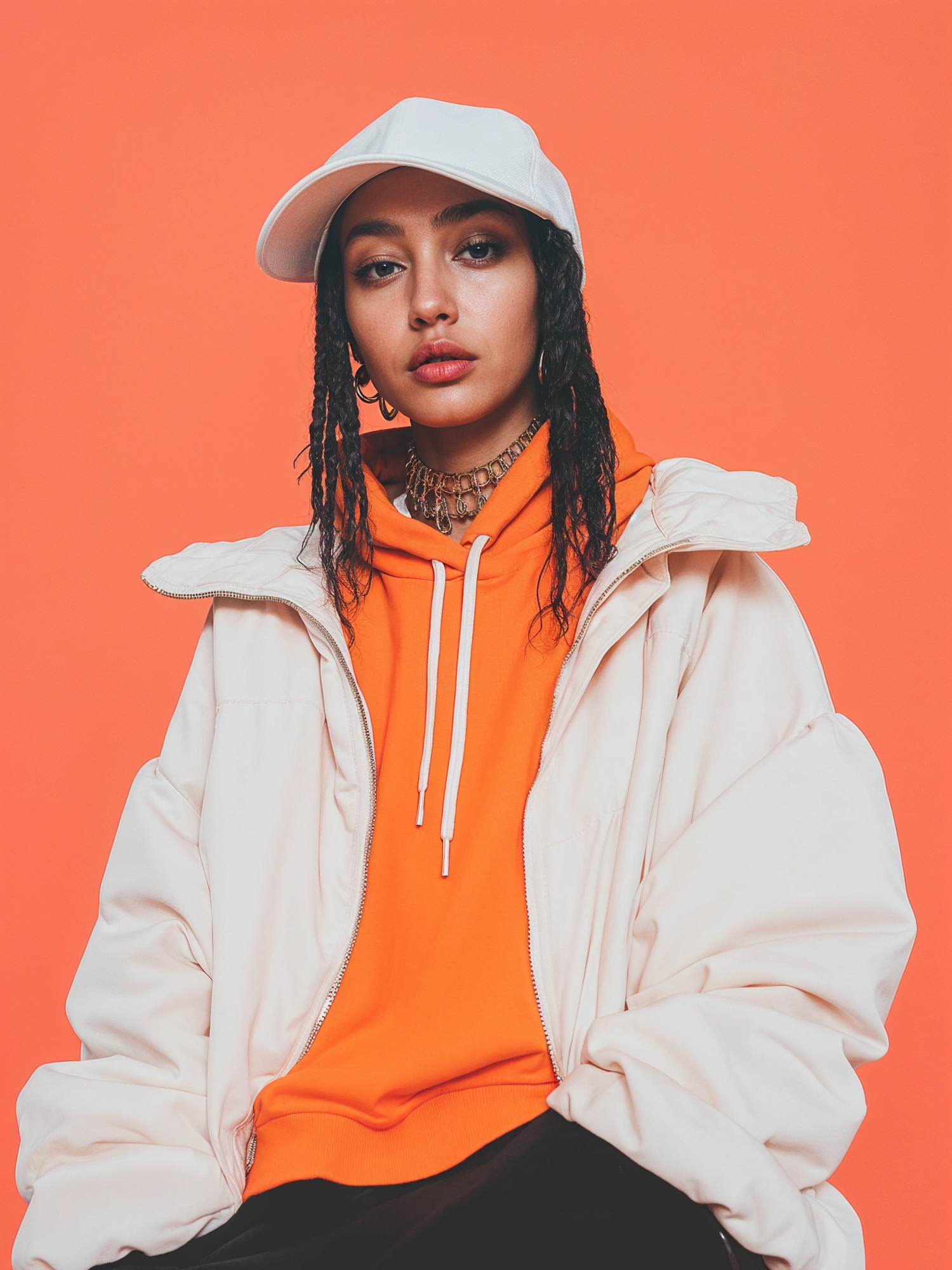 Stylish woman in white cap and jacket with orange hoodie against vibrant orange background, exuding urban fashion vibes.
