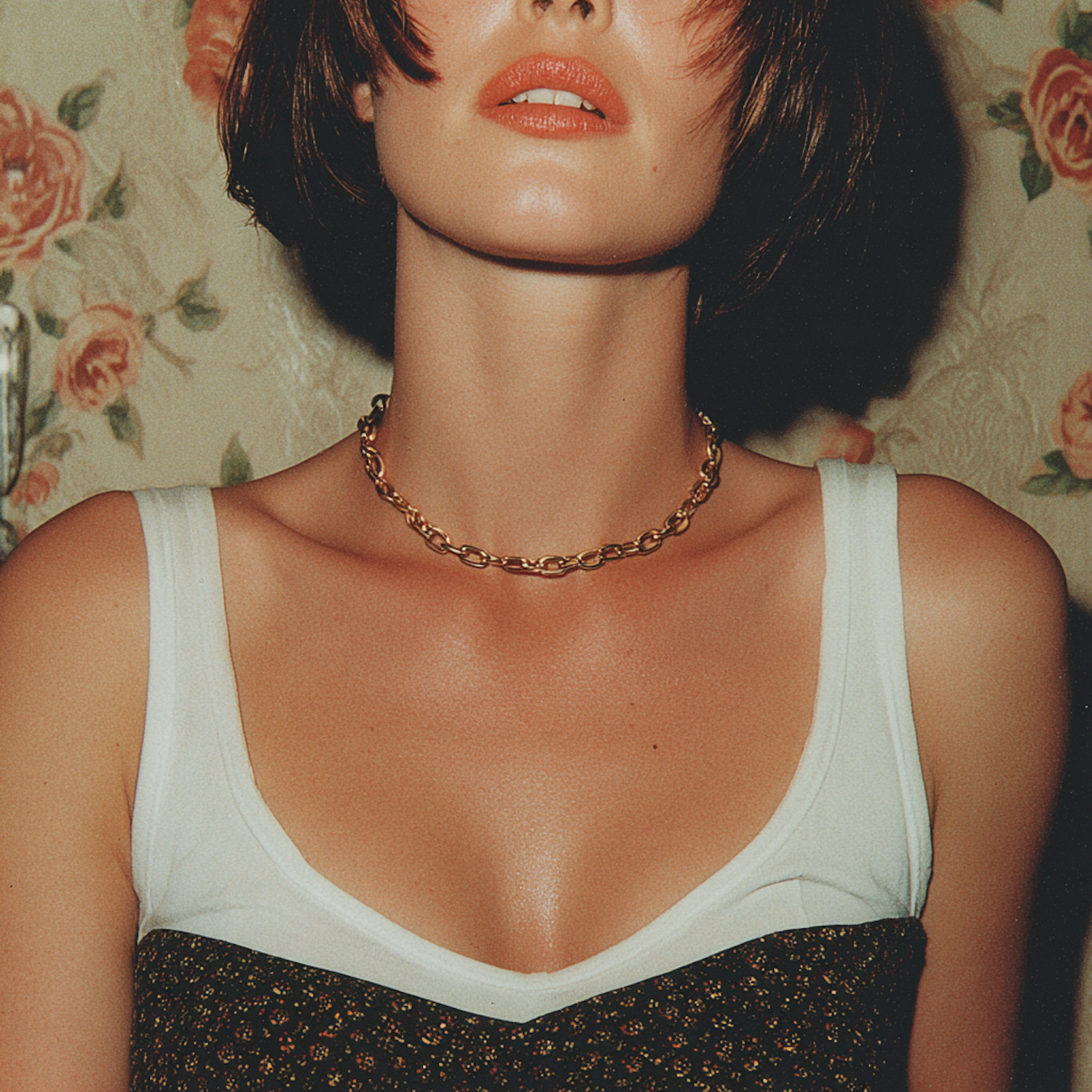 Close-up of a person wearing a gold chain necklace and a layered outfit against a floral wallpaper background.
