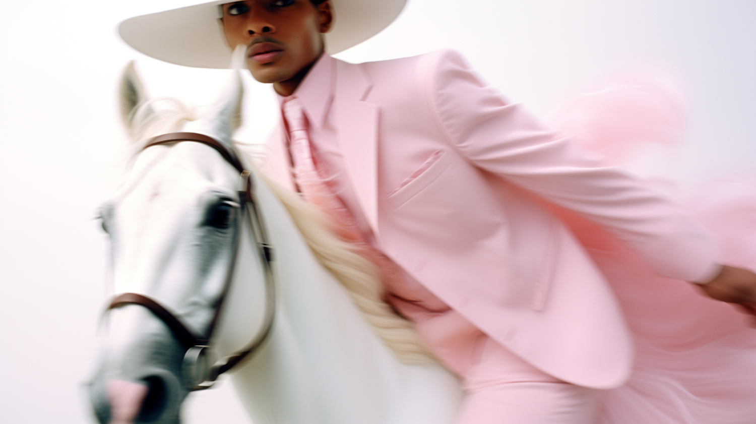 Stylish man in a pink suit and white hat riding a white horse, captured in dynamic motion with a blurred effect.