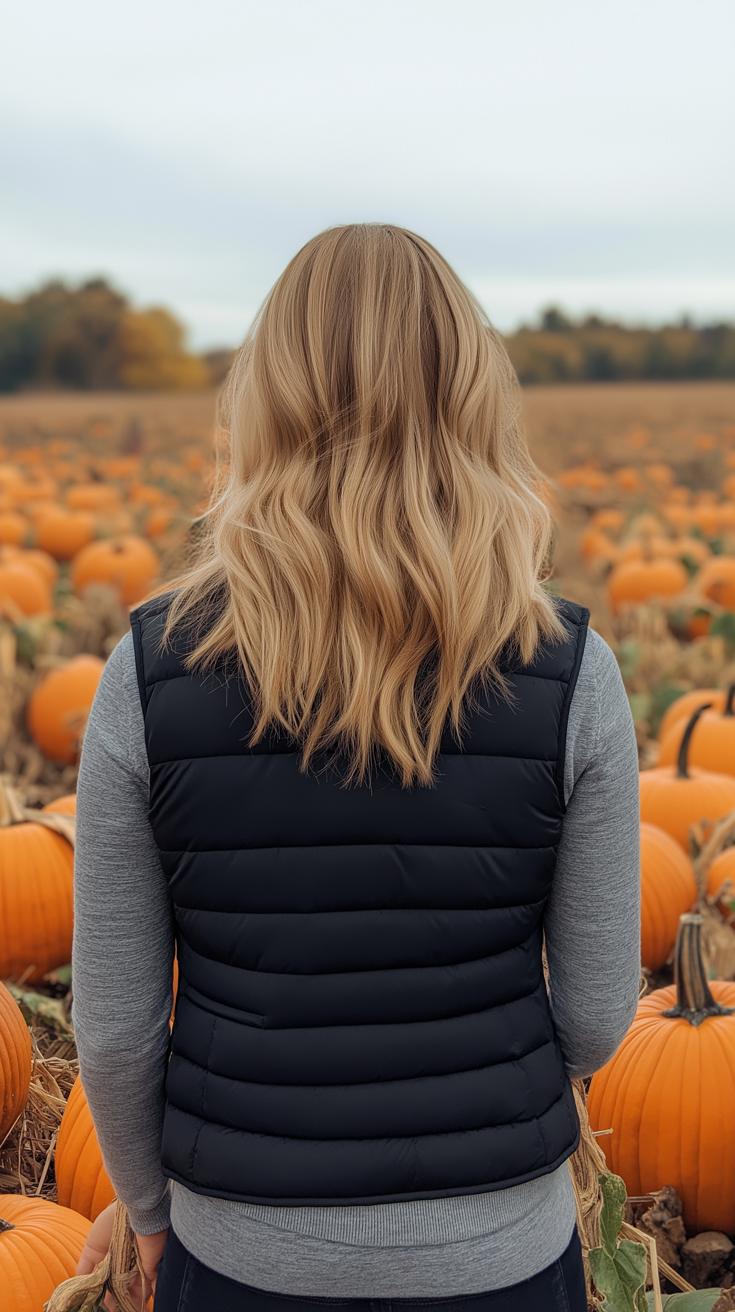Person with blonde hair in a black vest stands in a vibrant pumpkin patch under an overcast sky, surrounded by autumn colors.