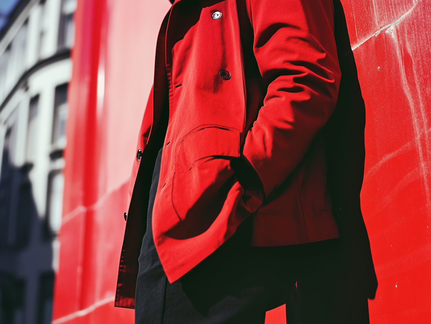 Person in a red coat against a matching red wall, creating a bold and vibrant visual contrast with dark pants.
