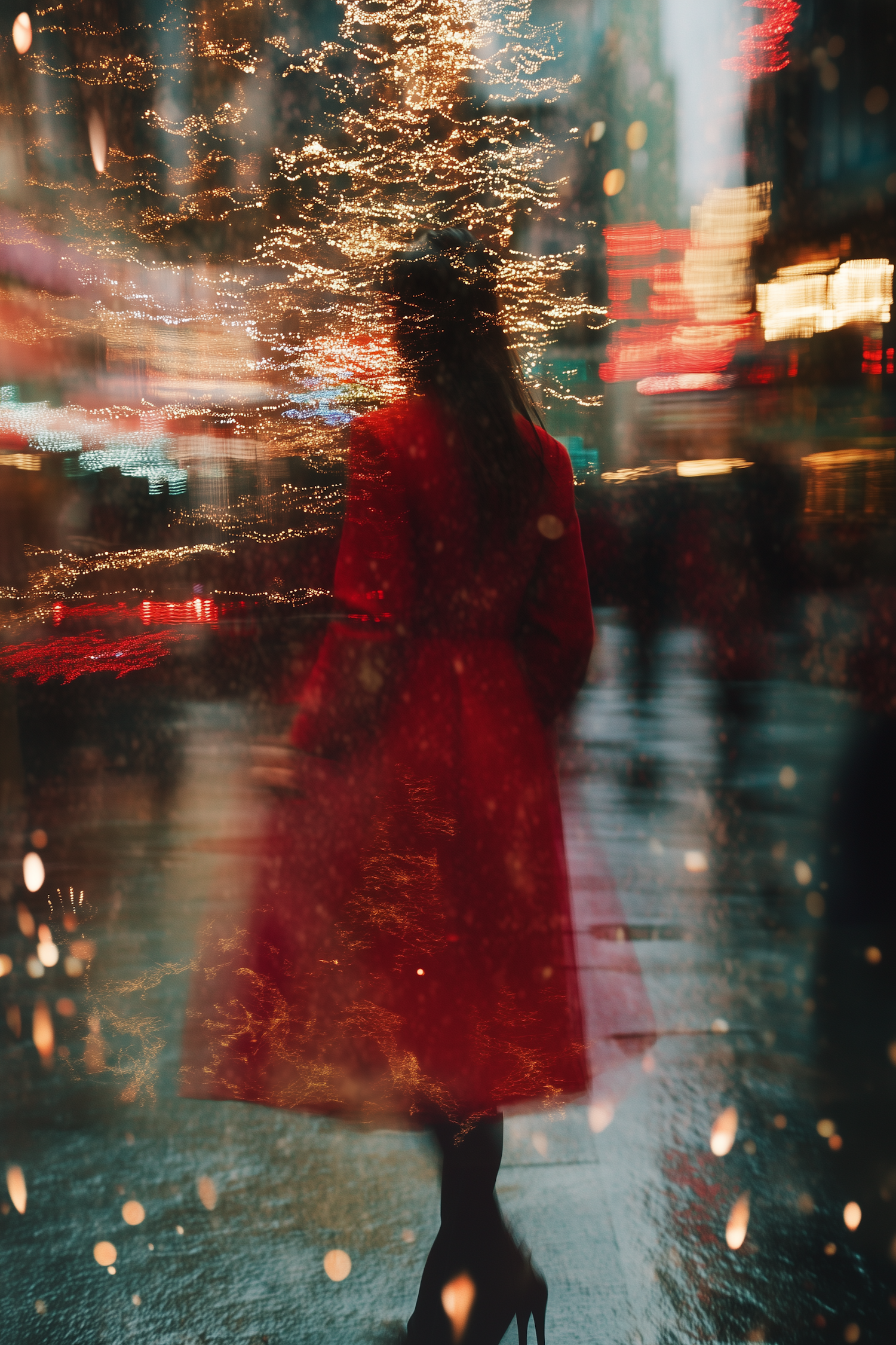 A woman in a red coat stands on a rainy city street, surrounded by glowing lights and reflections, creating a dreamy, festive atmosphere.