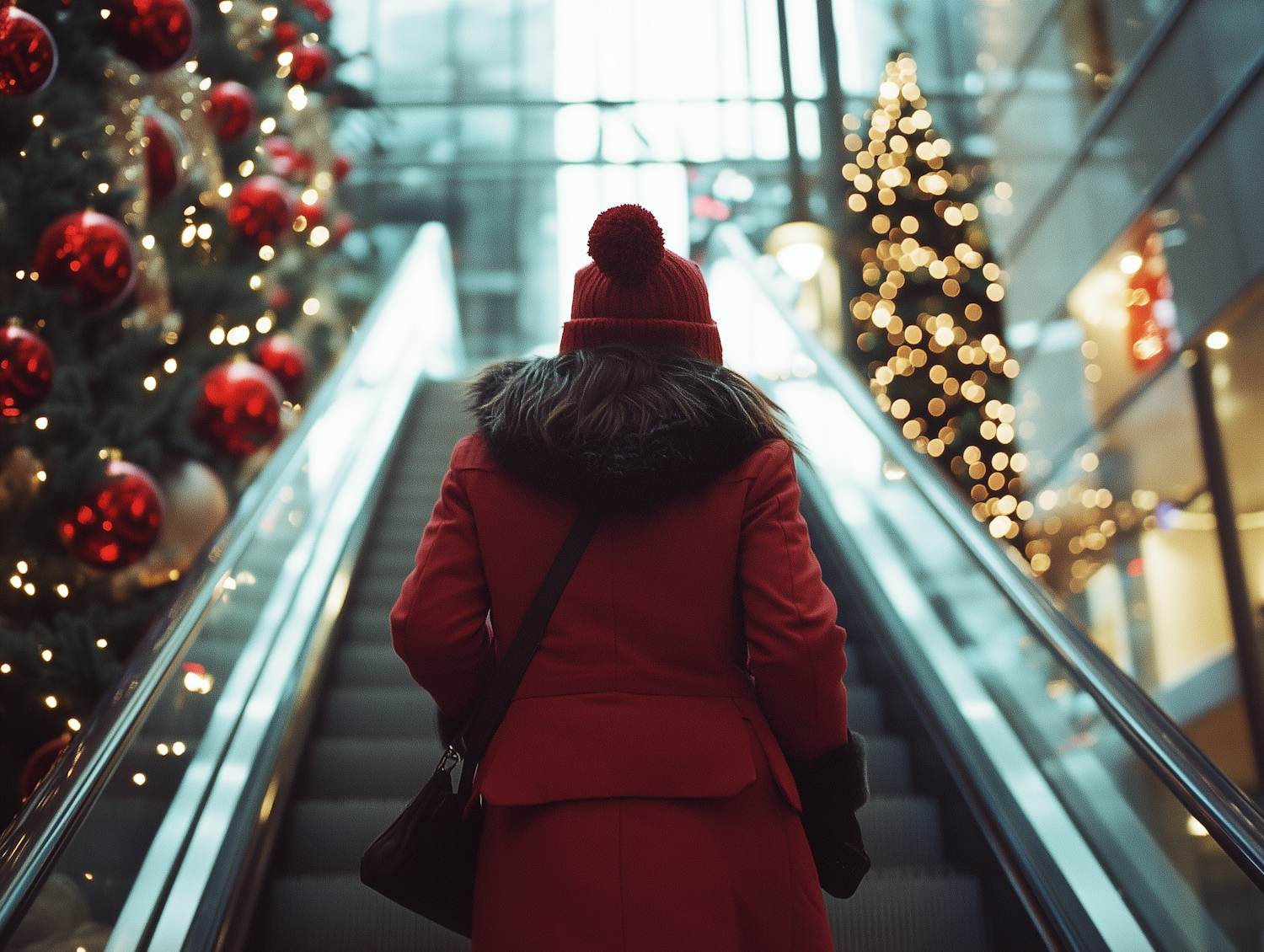 Person in red coat on escalator with festive Christmas trees and lights in a modern indoor setting.