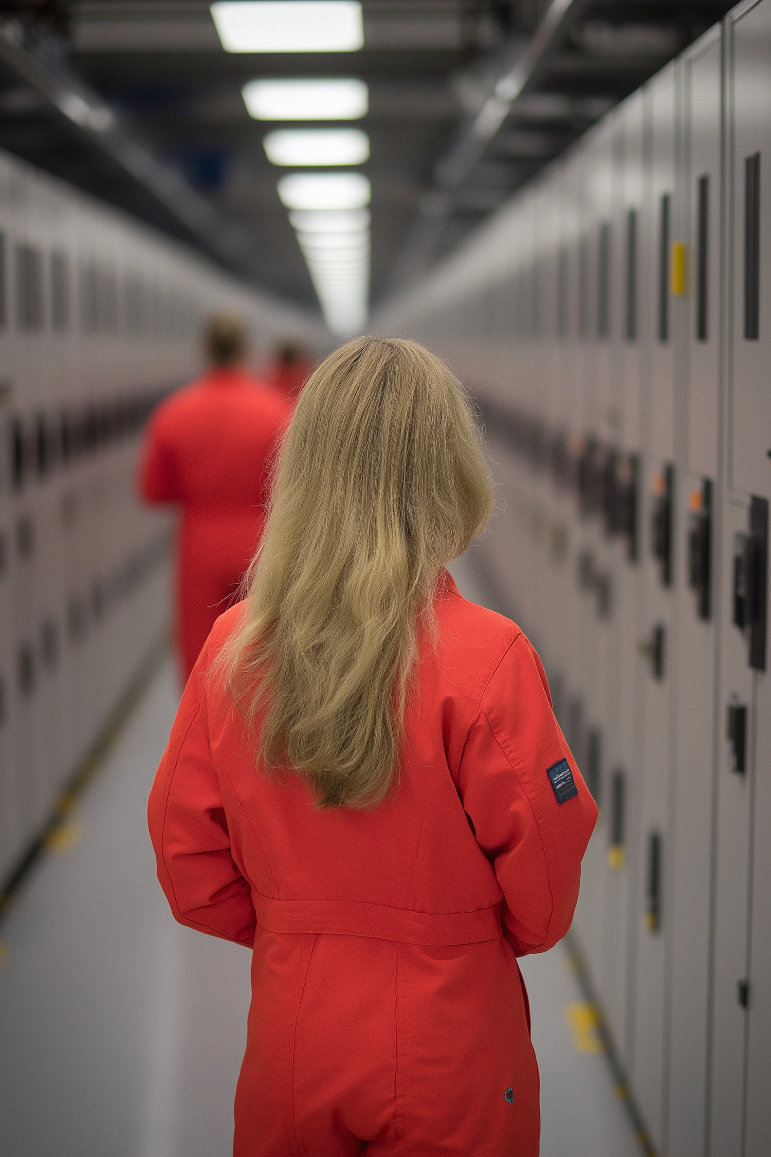 Person in red jumpsuit with long blonde hair walking in an industrial corridor, surrounded by machinery and bright lighting.