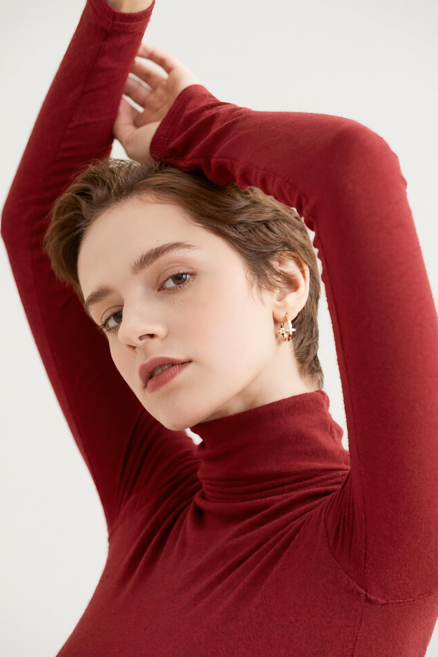 Person in a red turtleneck posing with arms raised, wearing gold hoop earrings, against a light background.