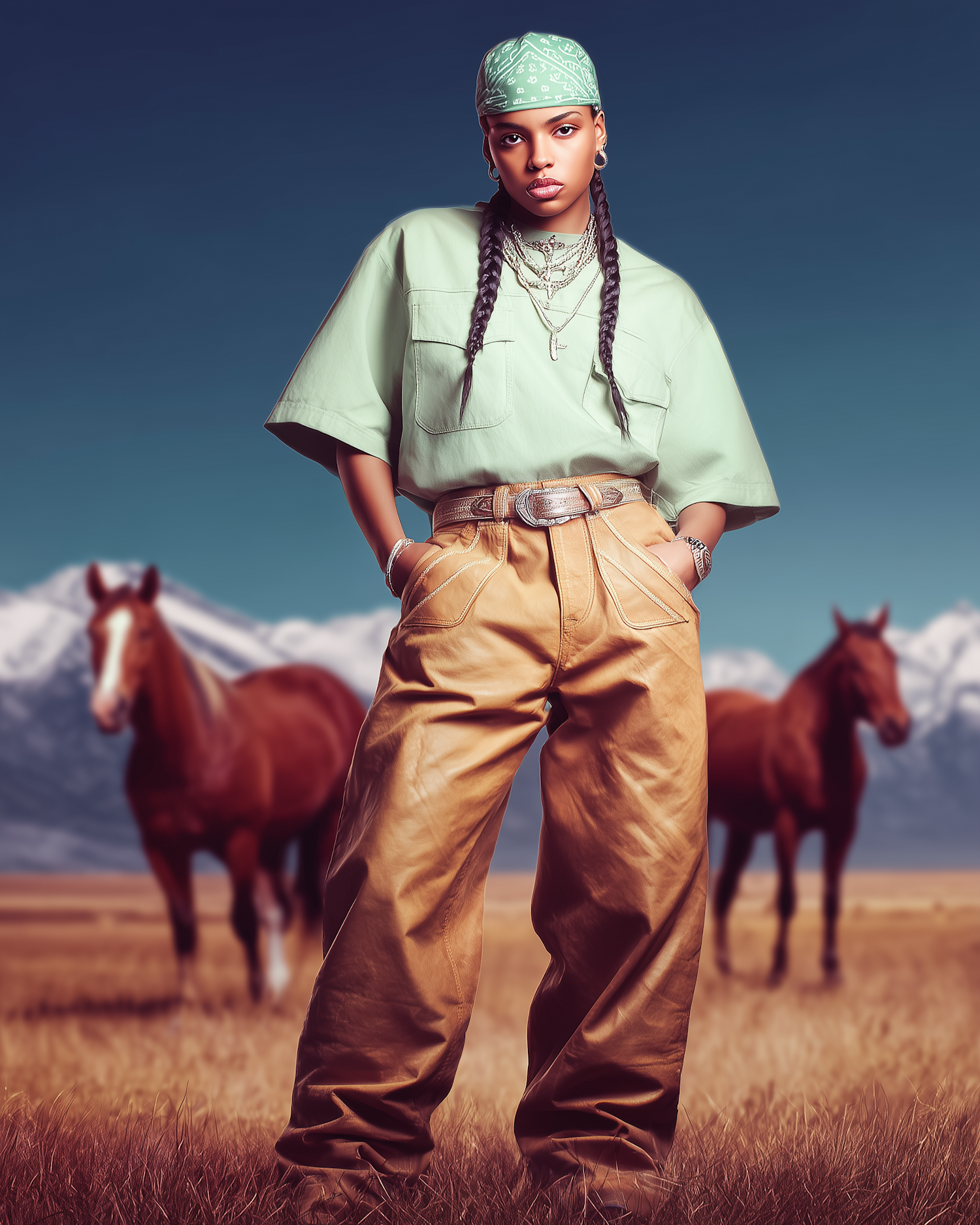 A stylish individual in a green shirt and tan pants stands in a field with horses and mountains in the background.