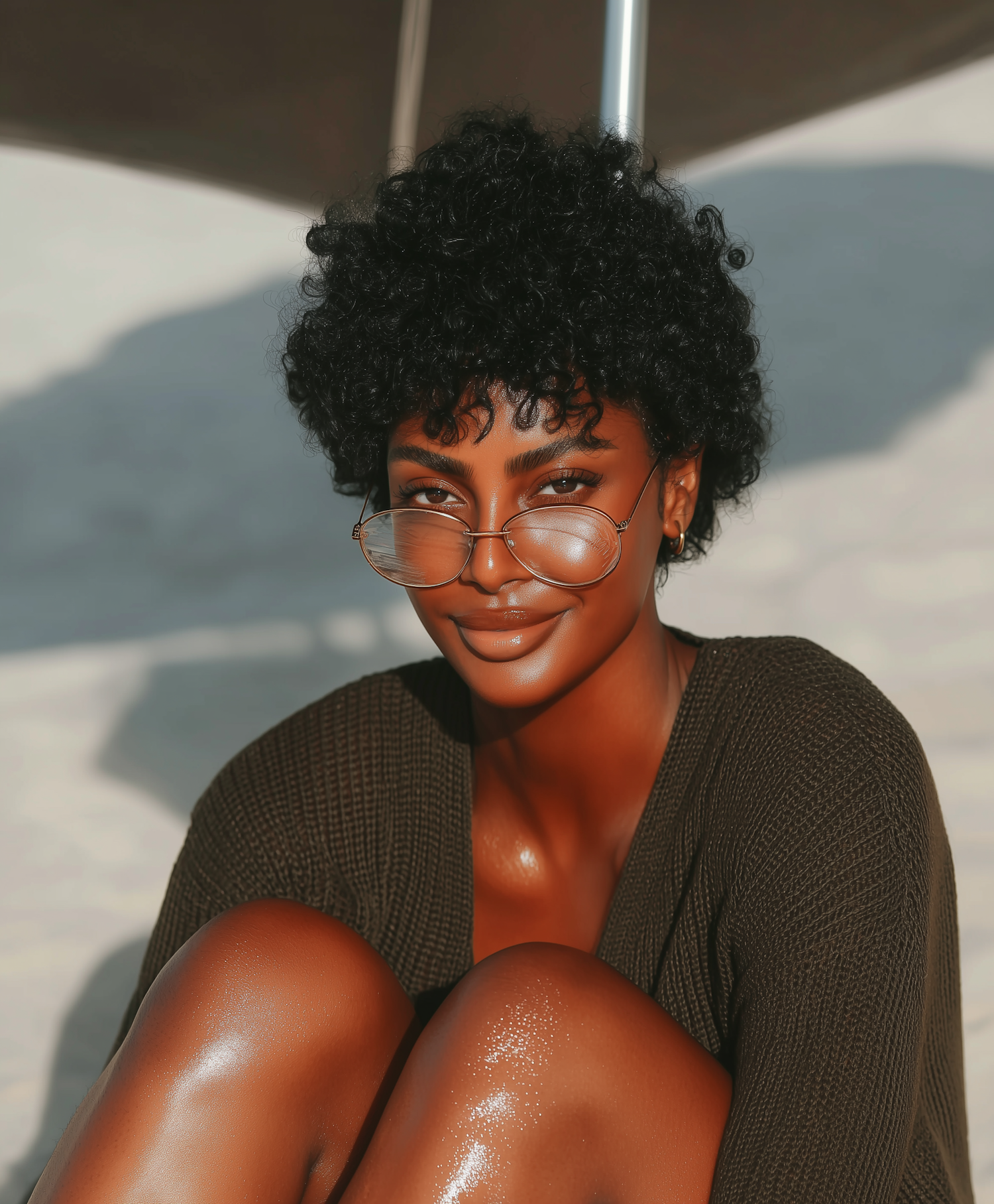 A person with dark curly hair and glasses, basking in sunlight, creating a relaxed and natural outdoor vibe.