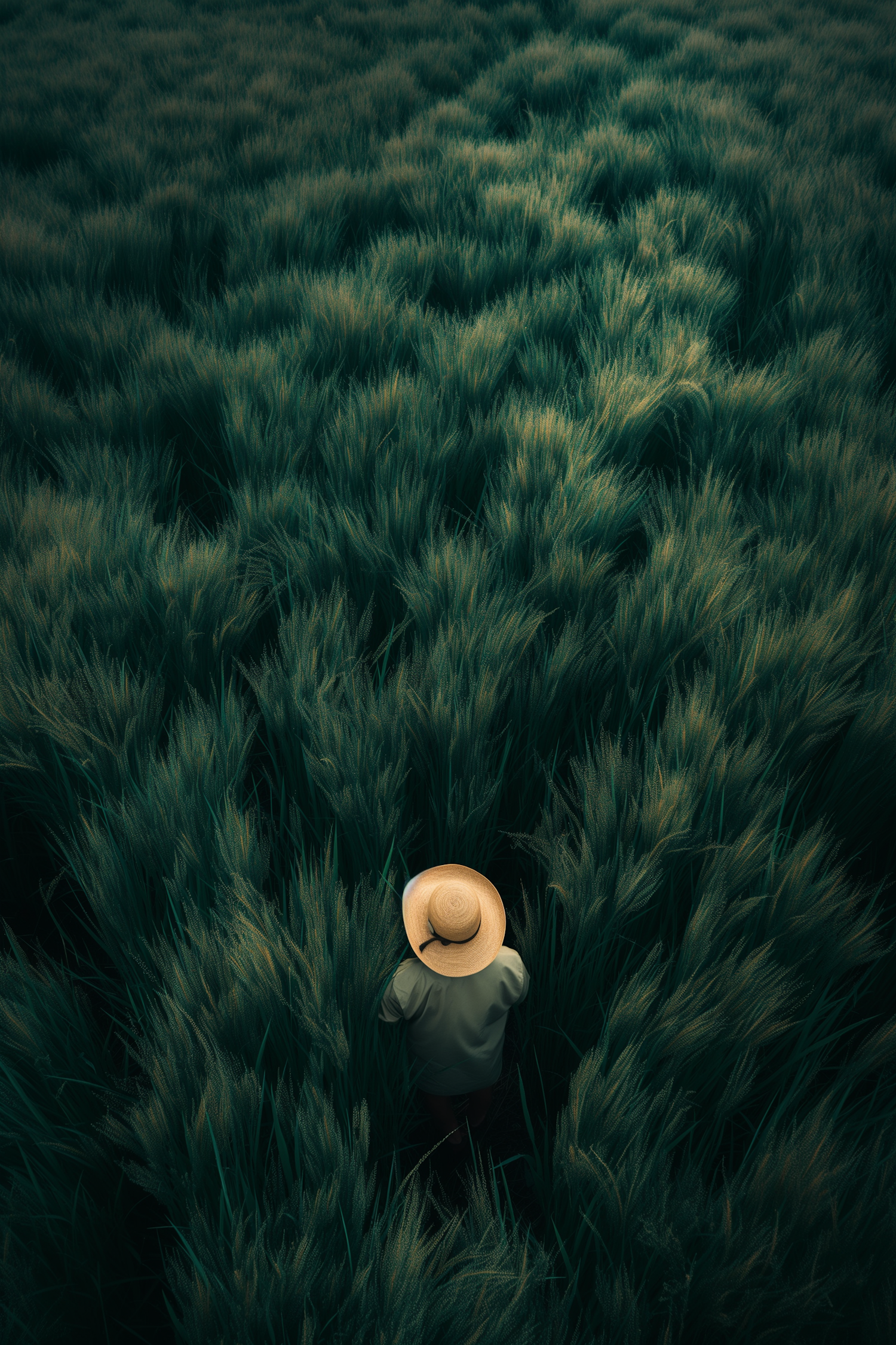 A person in a straw hat stands in a lush green field, surrounded by tall grass under soft lighting, evoking solitude and tranquility.