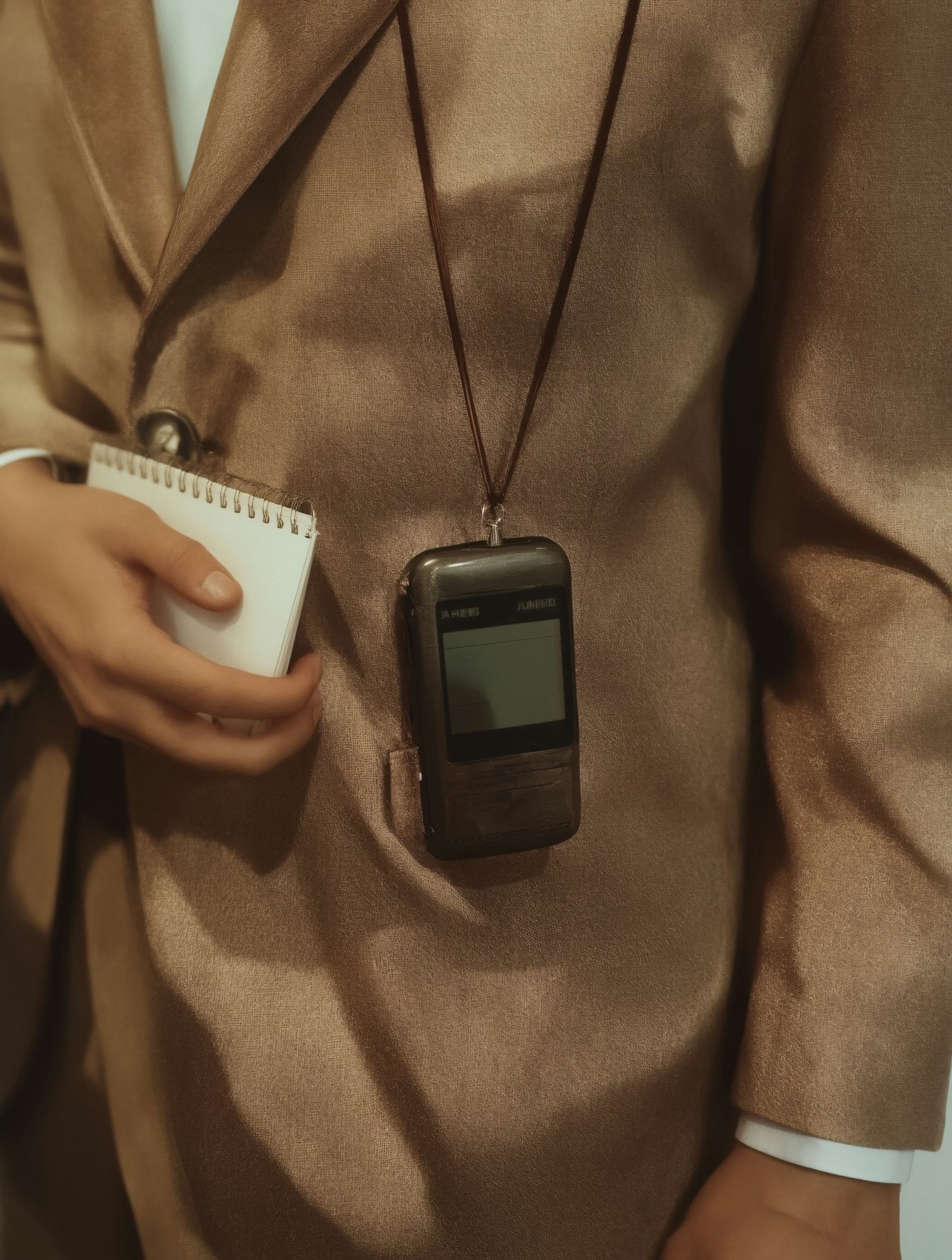 Close-up of a person in a tan suit holding a notepad, with a black electronic device on a lanyard around their neck.