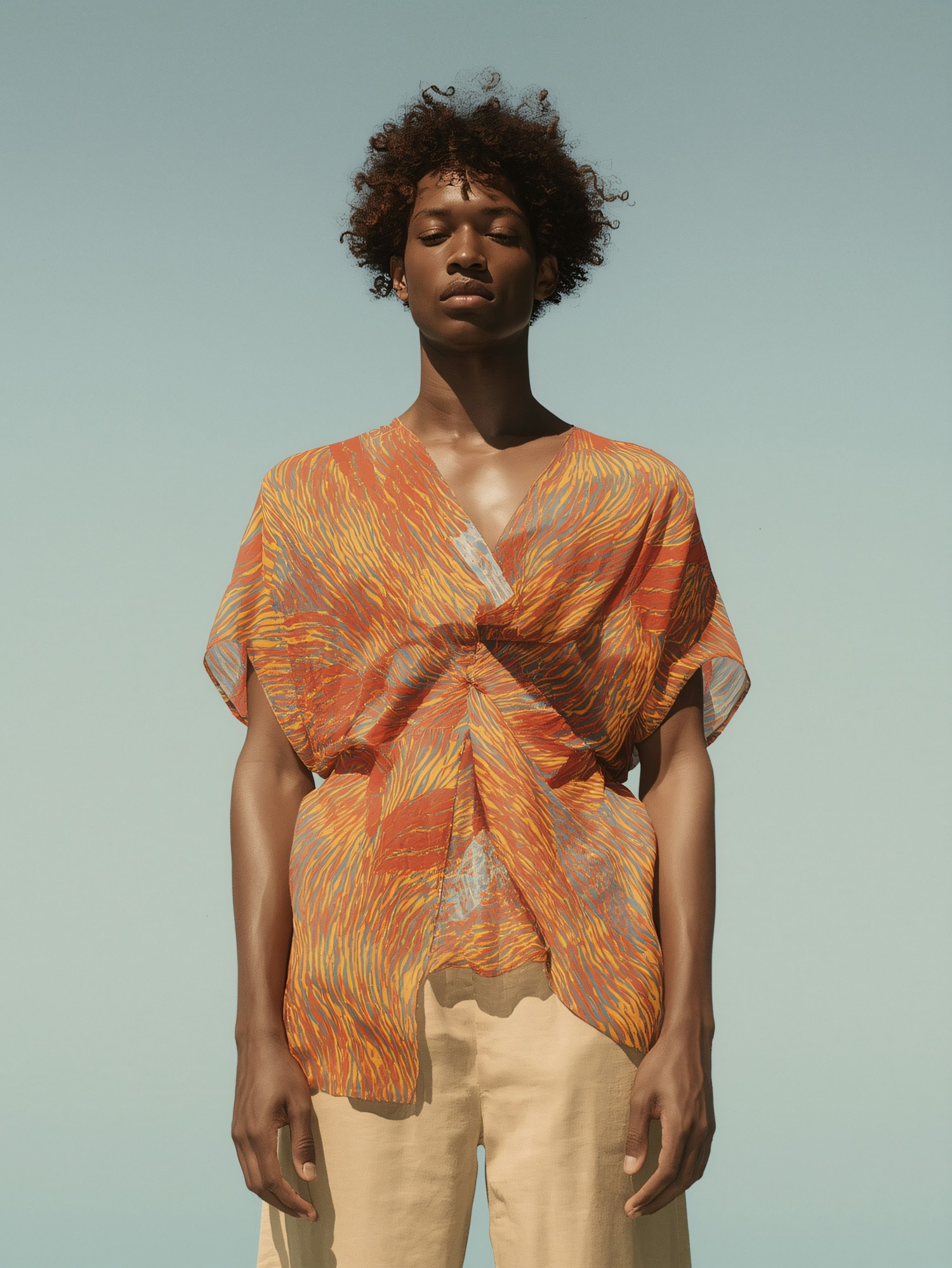 Stylish individual in a vibrant orange patterned top and beige pants, standing against a clear blue sky with a serene expression.