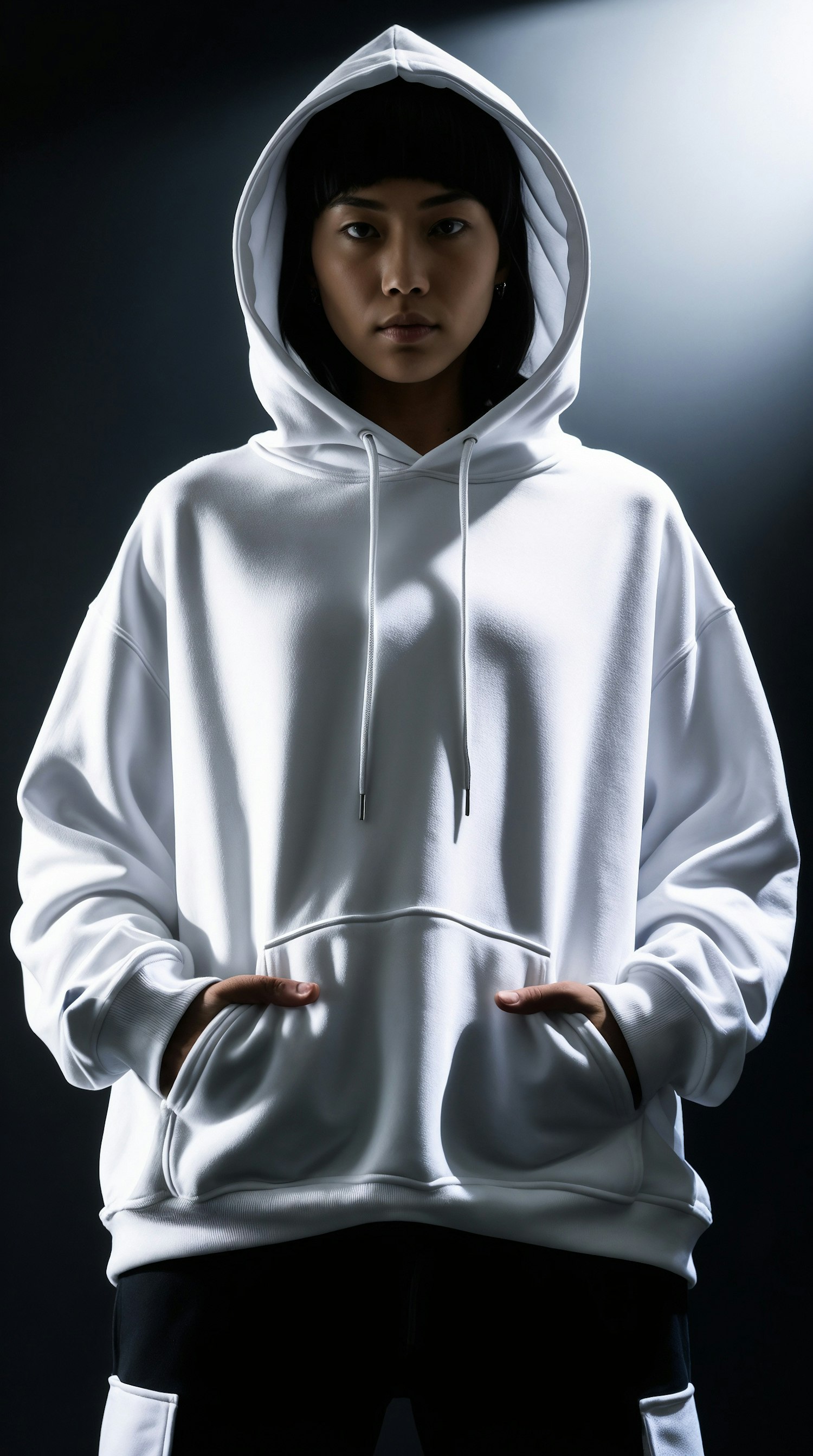 Asian woman in a white hoodie with hood up, serious expression, dramatic lighting, dark background, hands in pockets.