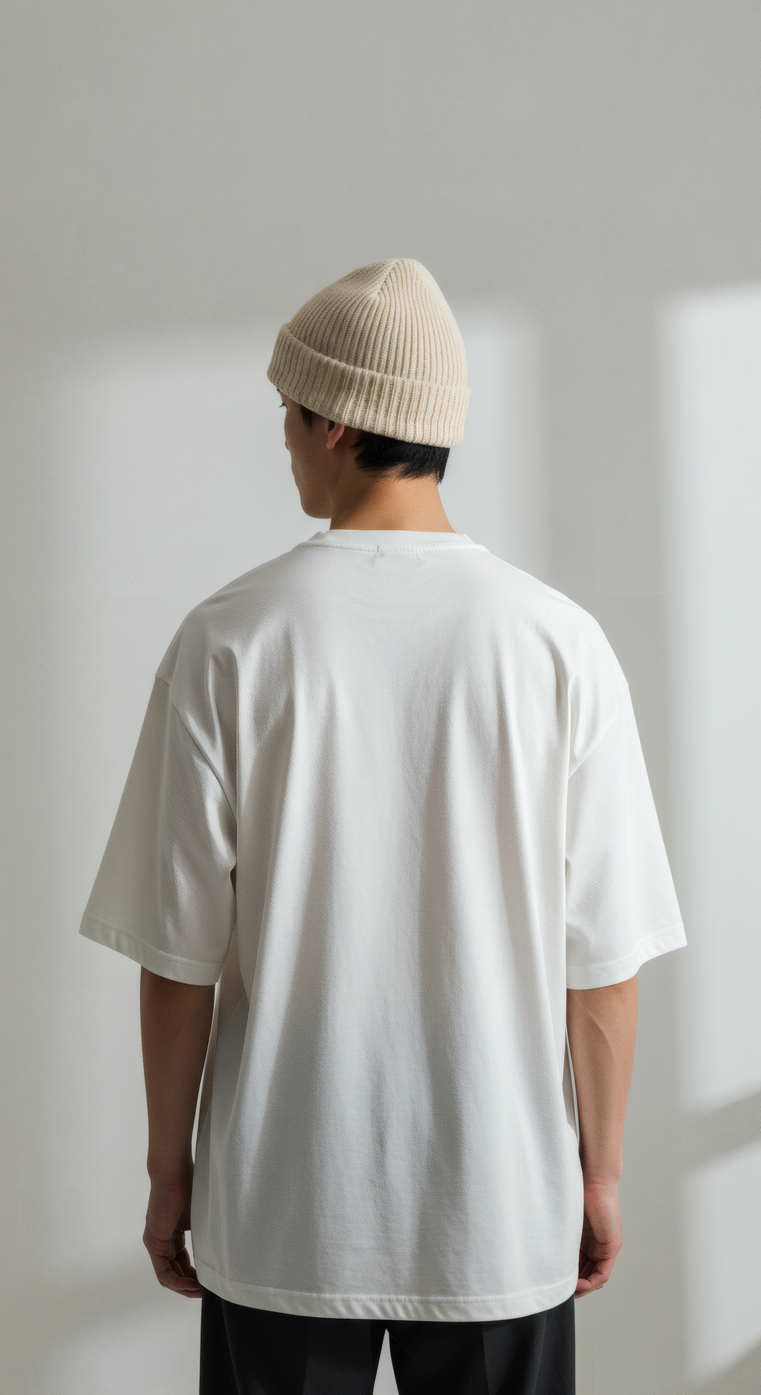 Minimalist fashion shot of a man in a white T-shirt, beige knit beanie, and black pants, standing in soft natural light.