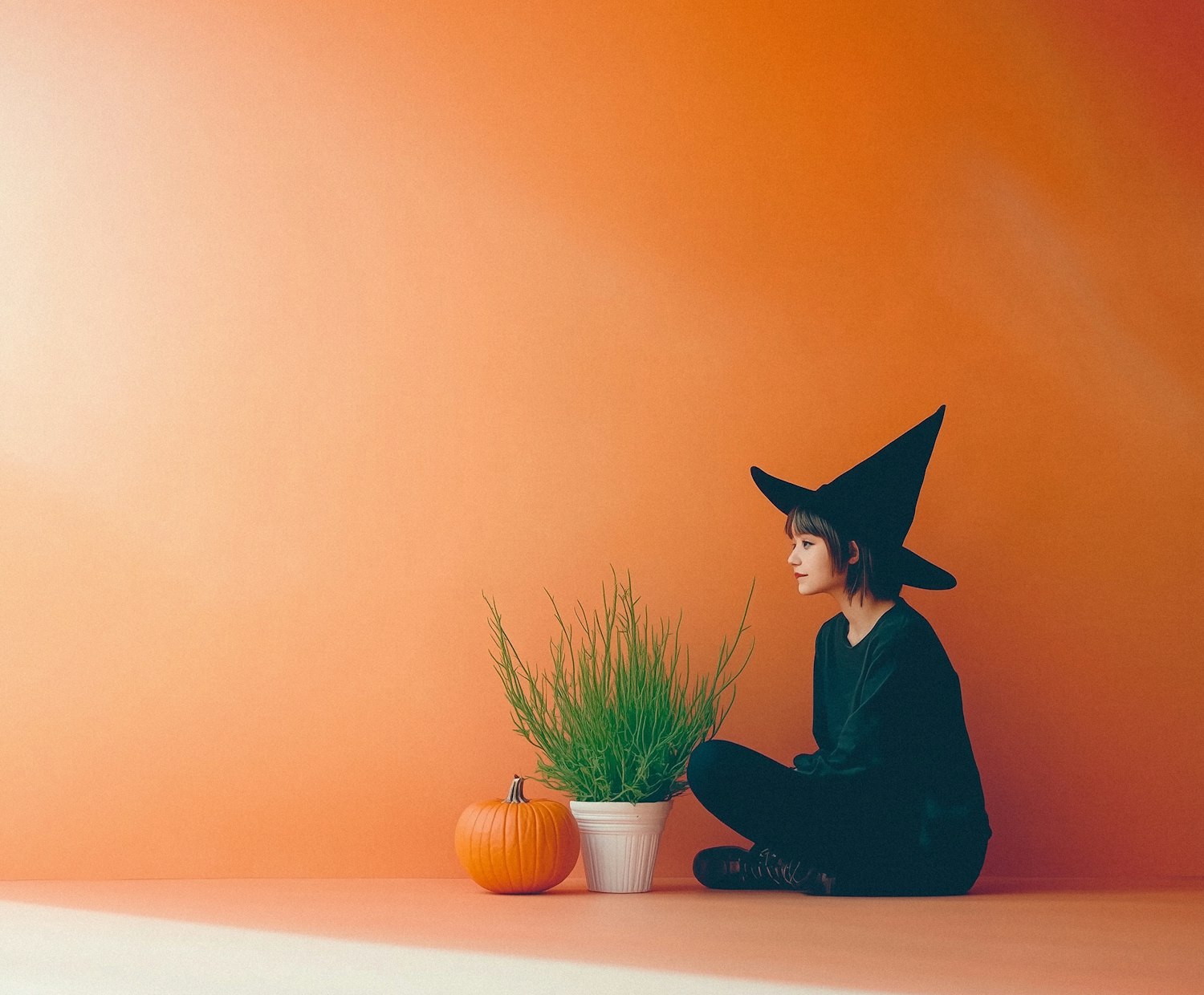 Young woman in witch hat sits with pumpkin and plant against orange background, creating a whimsical autumn scene.
