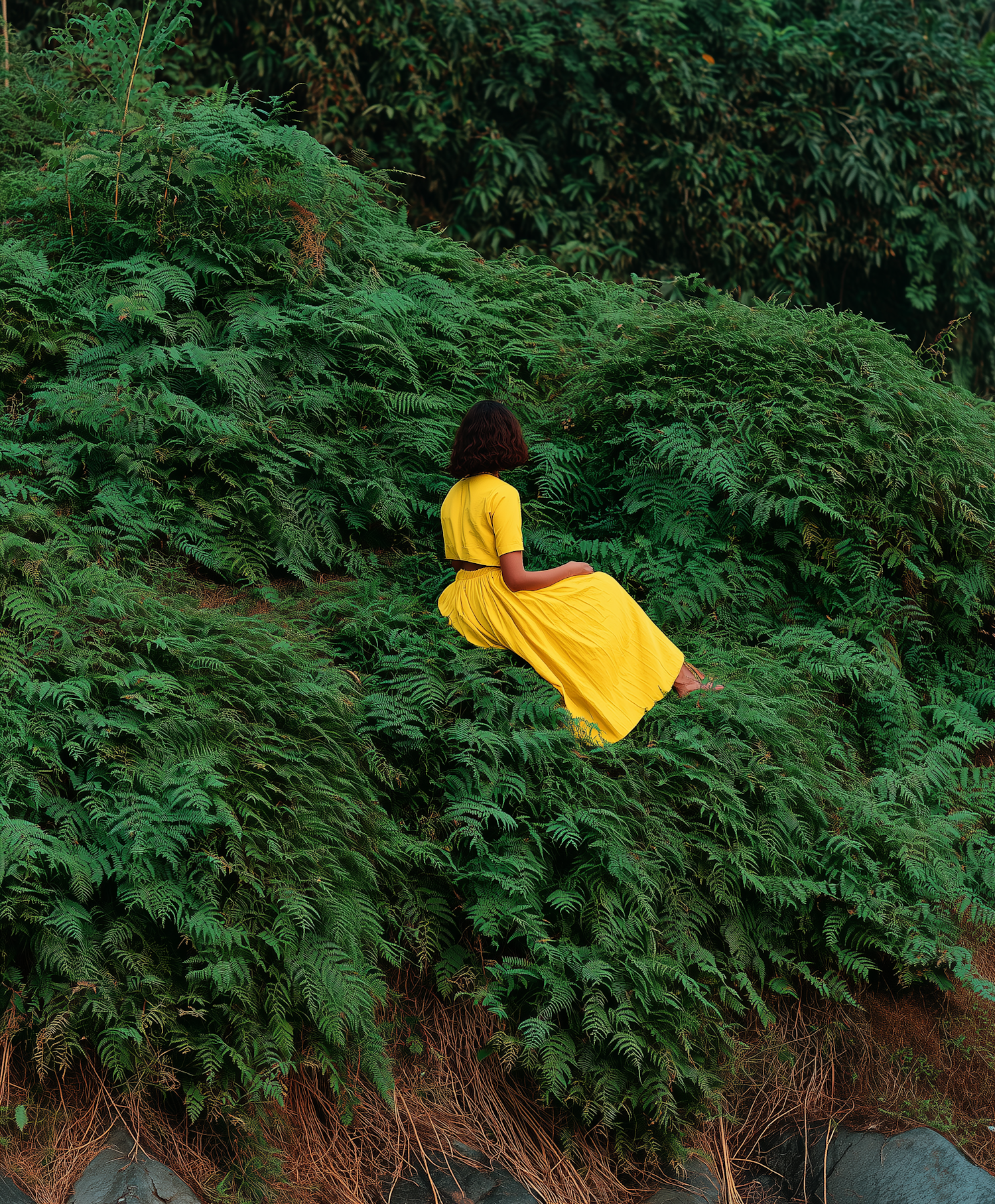 A person in a vibrant yellow dress sits on a lush green hillside covered in ferns, creating a serene and visually striking scene.