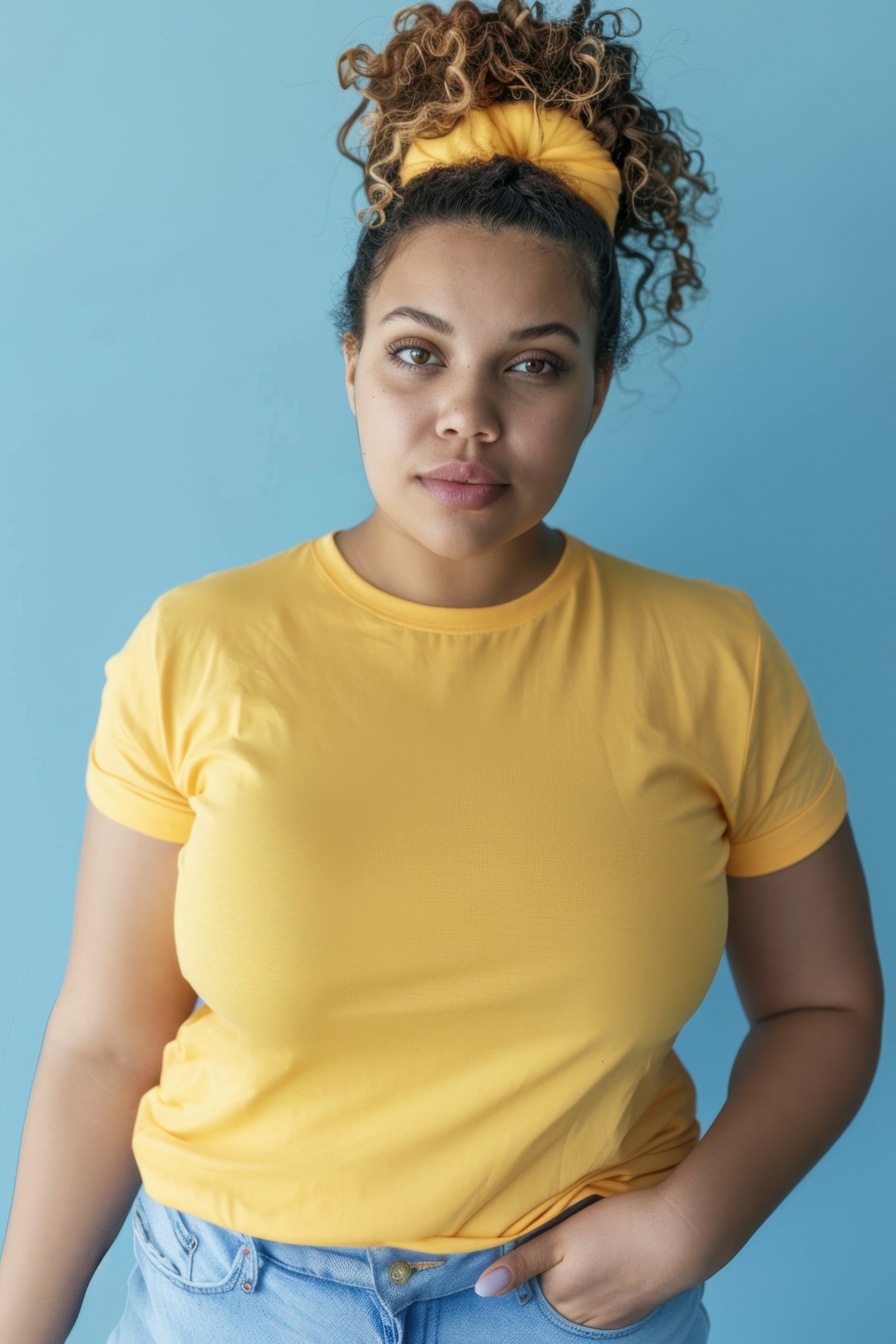 Young woman with curly hair in a yellow t-shirt against a blue background, exuding confidence and style.