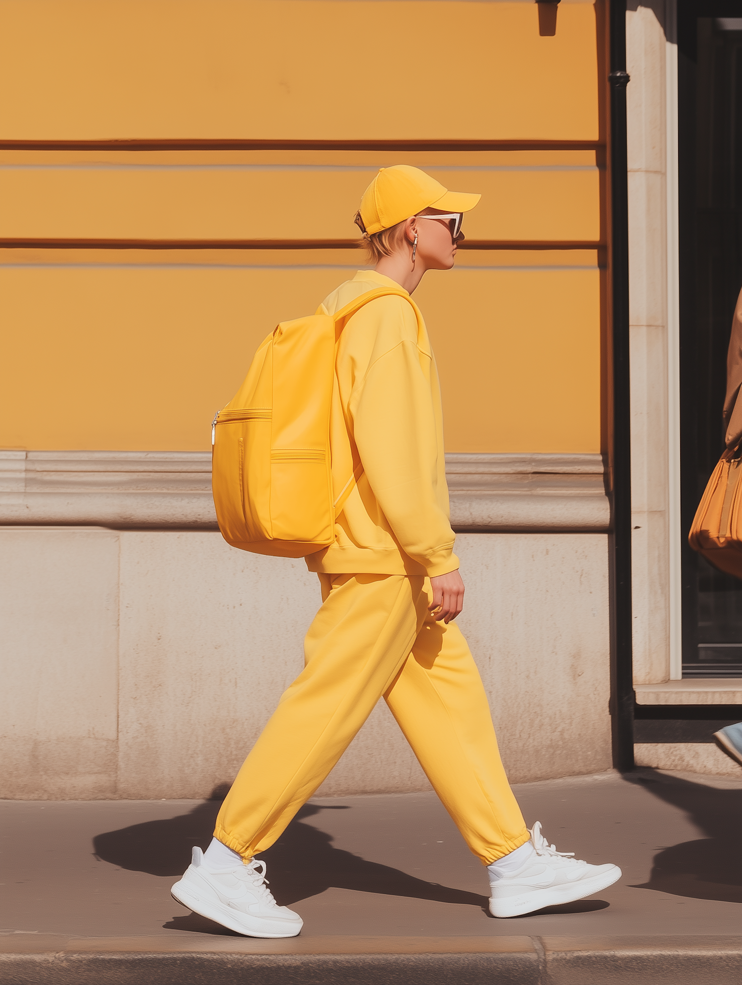 Person in all-yellow outfit walking by a matching yellow wall, wearing a cap, backpack, and white sneakers.