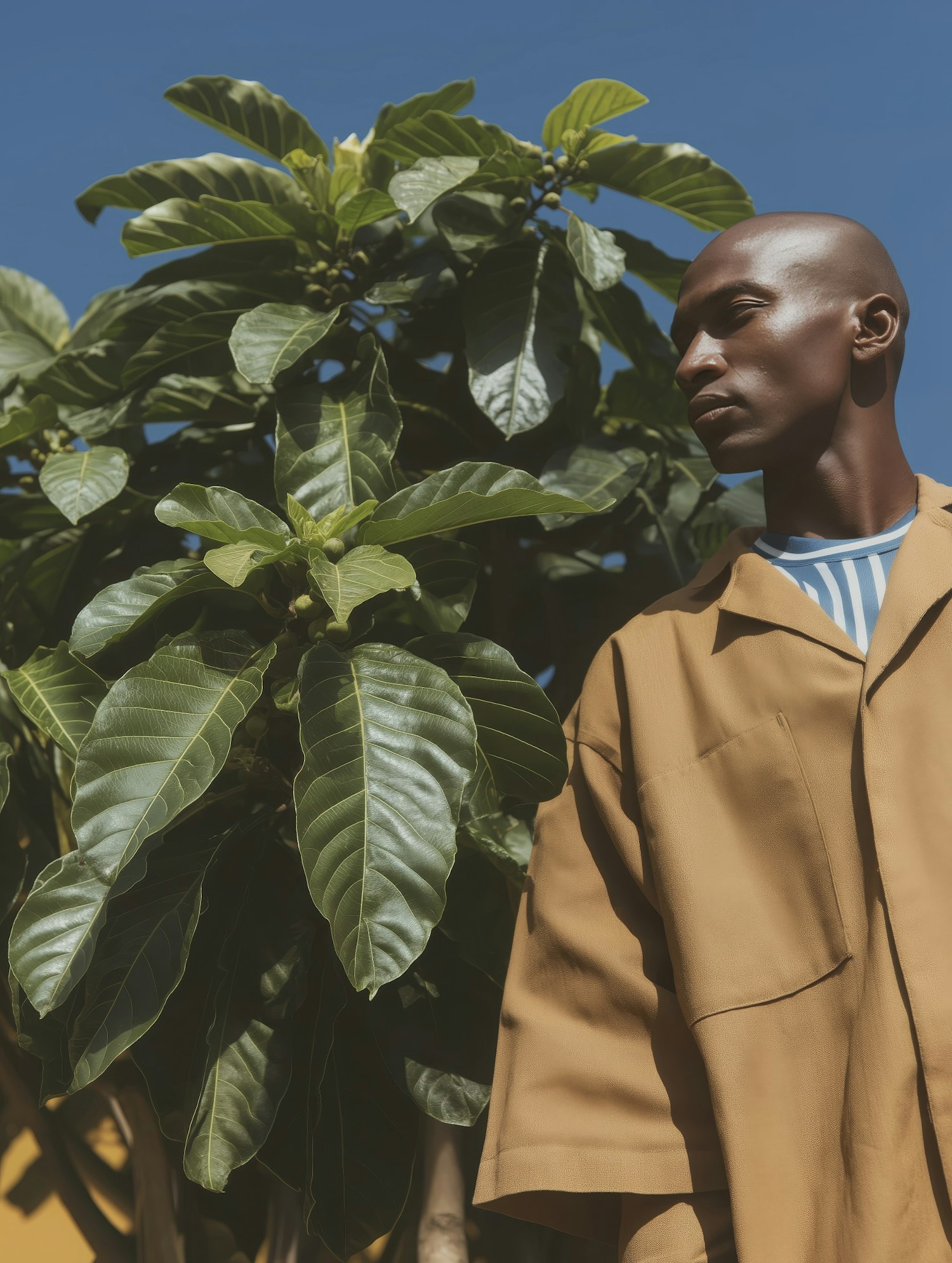 Stylish individual in a tan shirt stands near vibrant green foliage under a clear blue sky, creating a striking outdoor portrait.